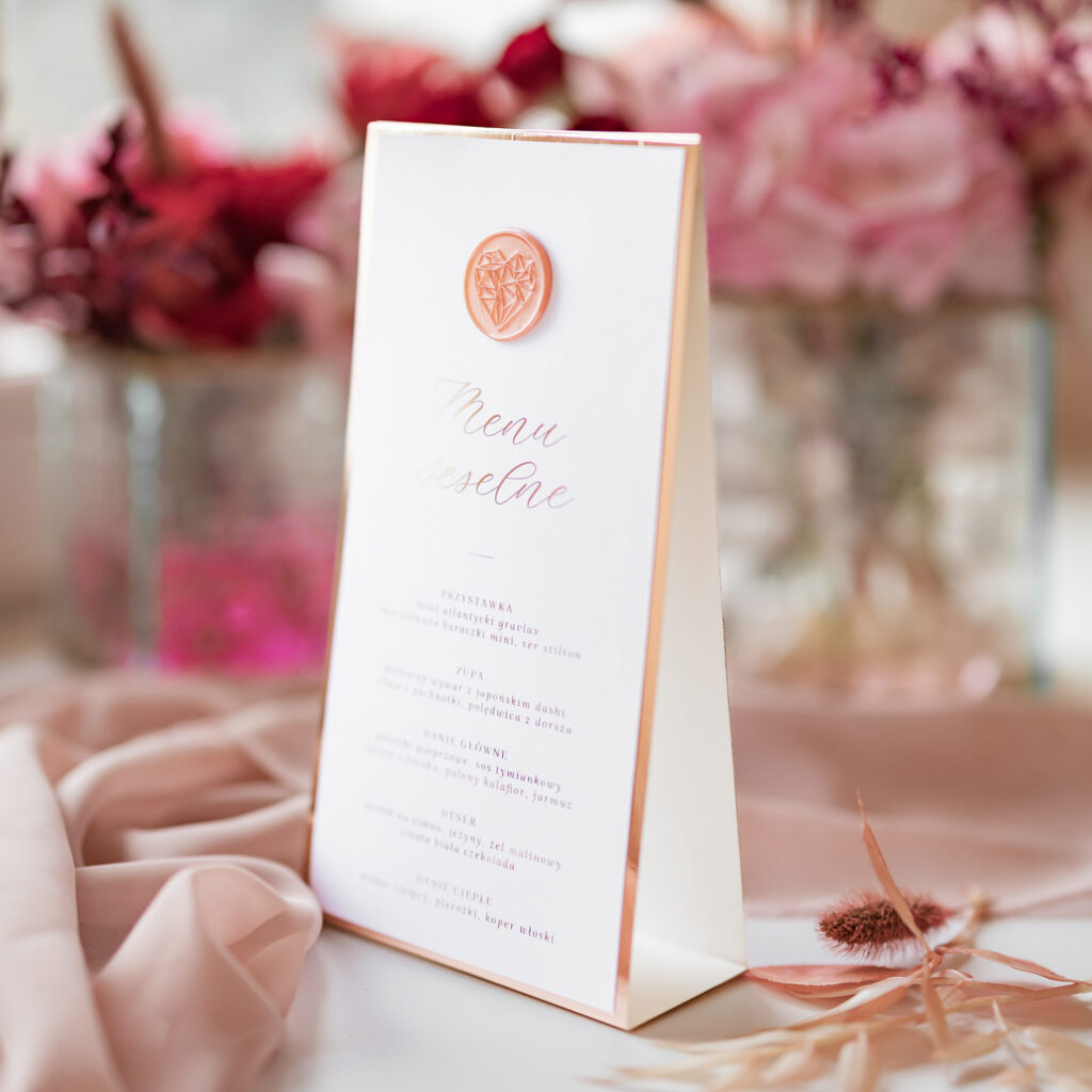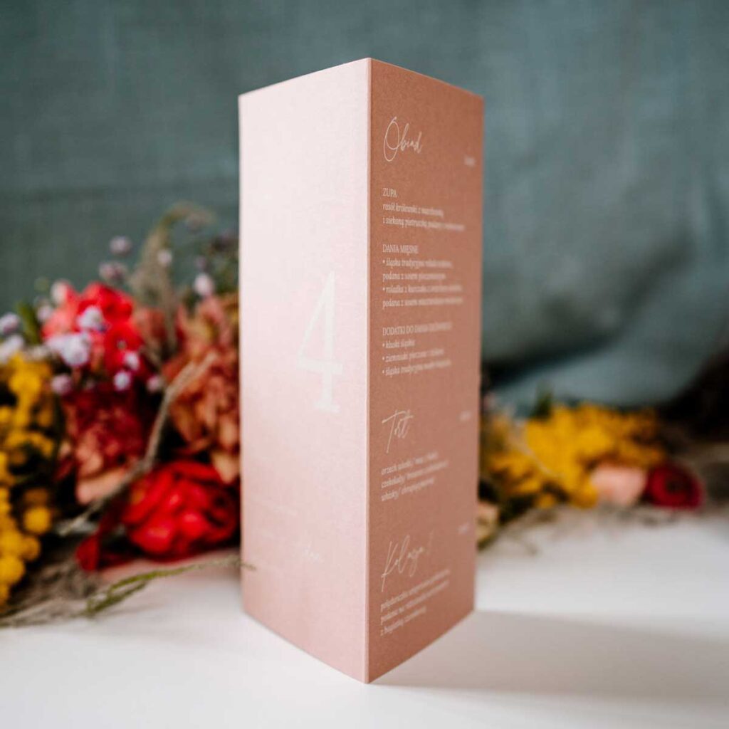 Menu w formie trójkąta to świetny wybór, jeśli chcecie wyeksponować wiele potraw, a dodatkowo umieścić inne informacje, takie jak numer stołu czy harmonogram wesela. Sprawdzi się idealnie na każdym rodzaju stołów, a dzięki swojej formie jest czytelne i dobrze widoczne na każdym stole.