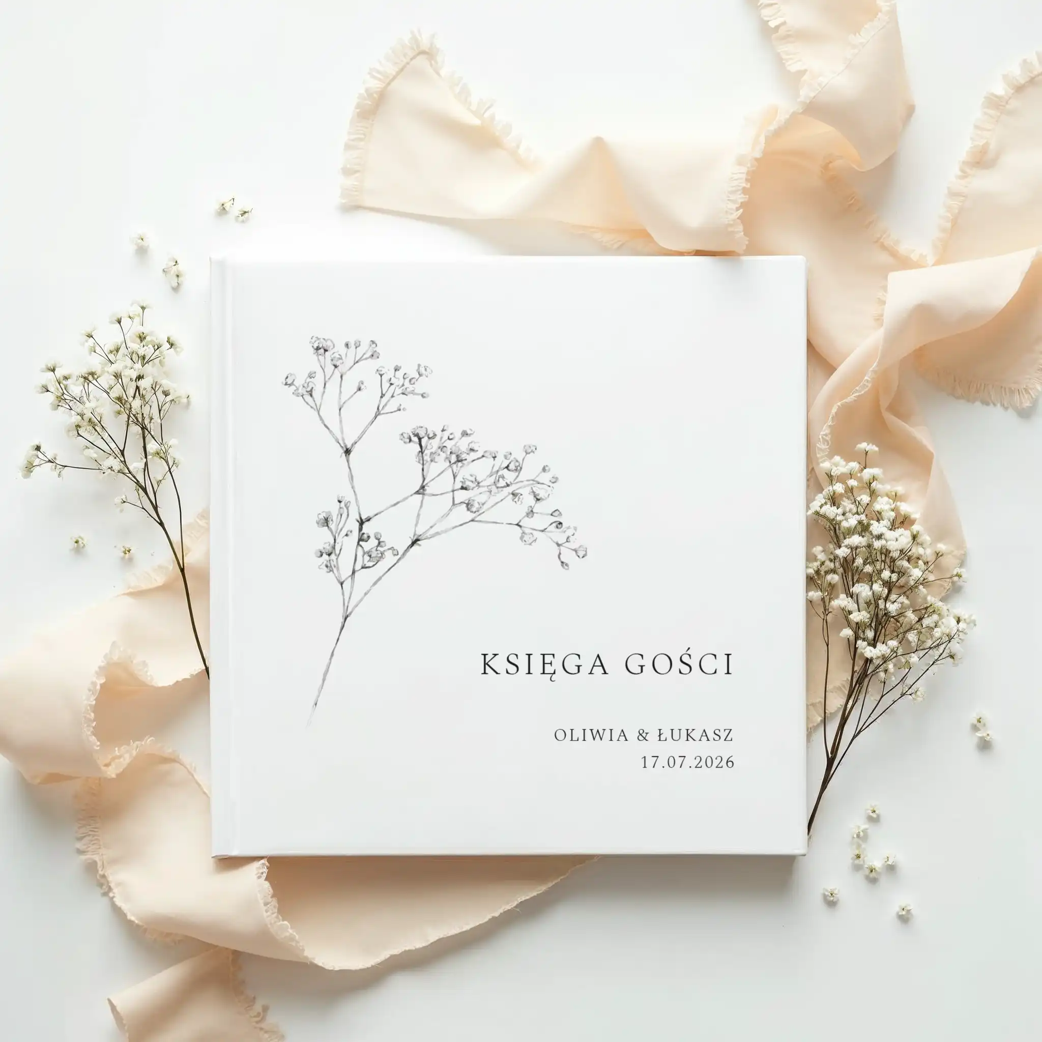 Księga gości Gipsówka to delikatna i subtelna pamiątka ślubna, która wprowadza romantyczny akcent do Waszej ceremonii. Inspirowana pięknem natury, z motywem kwiatów gipsówki, wpisuje się doskonale w ślubne aranżacje o charakterze botanicznym, rustykalnym i klasycznym. Księga ma elegancką, sztywną oprawę, która zapewnia trwałość, a jej minimalistyczny styl podkreśla wyjątkowy charakter wydarzenia.
