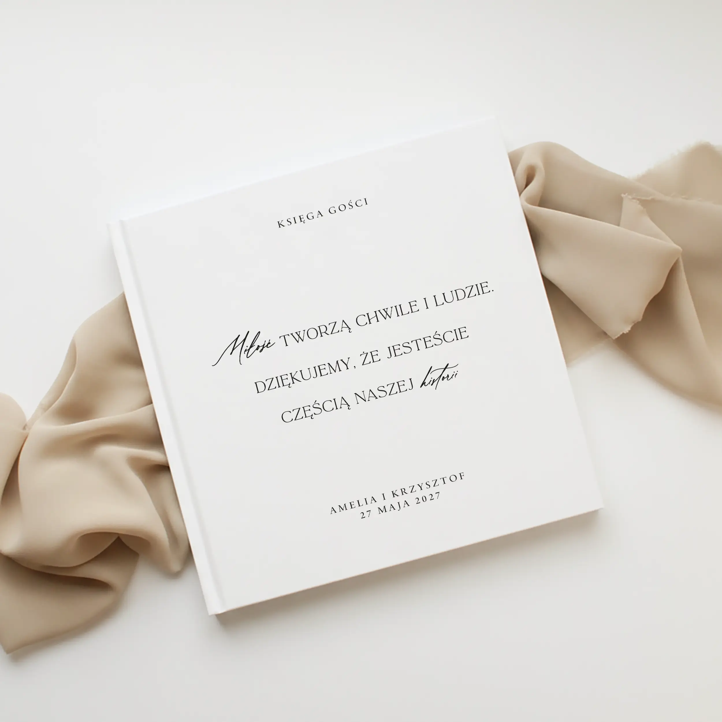 Księga gości z kolekcji Kremowe to połączenie elegancji i prostoty. Jasna oprawa, klasyczny układ i subtelna typografia tworzą minimalistyczną całość, która pięknie prezentuje się na stole podczas przyjęcia. Taki detal nie tylko uzupełnia oprawę wydarzenia, ale również zachęca gości do pozostawienia kilku słów od serca.