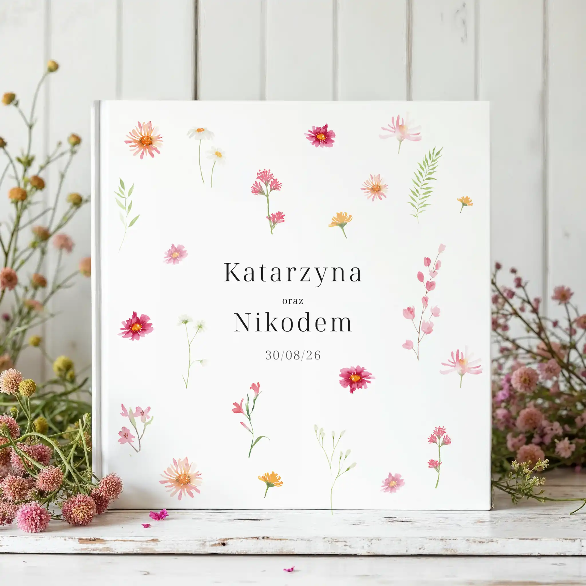 W księdze gości Polne Kwiaty znajdzie się miejsce na życzenia, ciepłe słowa i przemyślenia, które goście będą mogli zostawić na pamiątkę. Jej delikatny, kwiatowy wzór idealnie komponuje się z innymi elementami w naturalnym stylu, tworząc spójną i harmonijną oprawę ślubną. Ten wyjątkowy dodatek pozwoli zachować wspomnienia z dnia ślubu na dłużej i stanie się cenną pamiątką pełną wzruszeń i radości.