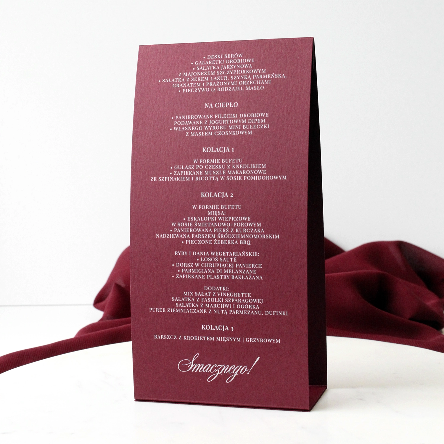 Menu Burgundowe to elegancki element dekoracyjny, który w subtelny sposób podkreśla charakter przyjęcia. Stonowana typografia i klasyczny układ wpisują się w ponadczasowy styl, a całość doskonale komponuje się z pozostałymi dodatkami z kolekcji Burgund. To idealny wybór dla par, które cenią harmonię, szyk i dbałość o każdy detal weselnej aranżacji.