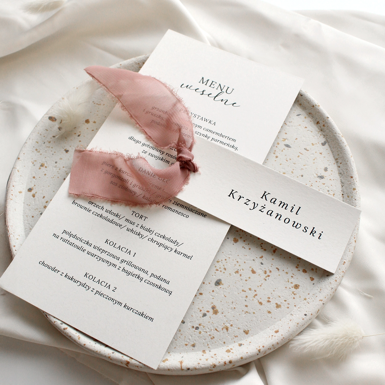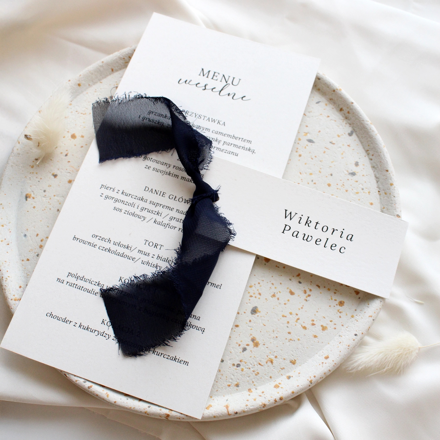 Menu Szarpana wstążka to elegancka karta dań o minimalistycznym układzie i nowoczesnej typografii. Subtelny papier i delikatny układ tekstu tworzą spójną całość, idealnie współgrając z pozostałymi elementami kolekcji Szarpana wstążka. To stylowy dodatek, który pięknie prezentuje się na stole i podkreśla dopracowany charakter przyjęcia.