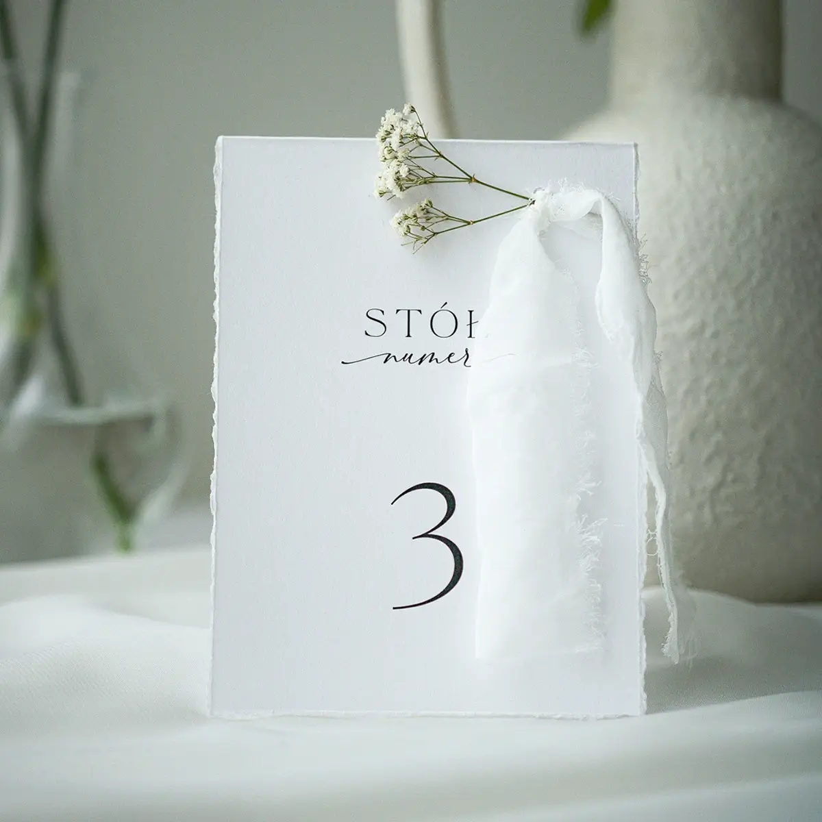Eleganckie numery stołów, które doskonale dopełnią dekorację sali weselnej. Dostępne w dwóch wersjach: śmietankowej z delikatnie szarpanymi brzegami oraz lastryko z prostym wykończeniem. Subtelne akcenty, takie jak szarpana wstążka i suszona gipsówka, dodają uroku i naturalnego stylu.