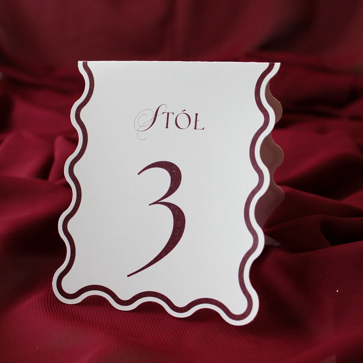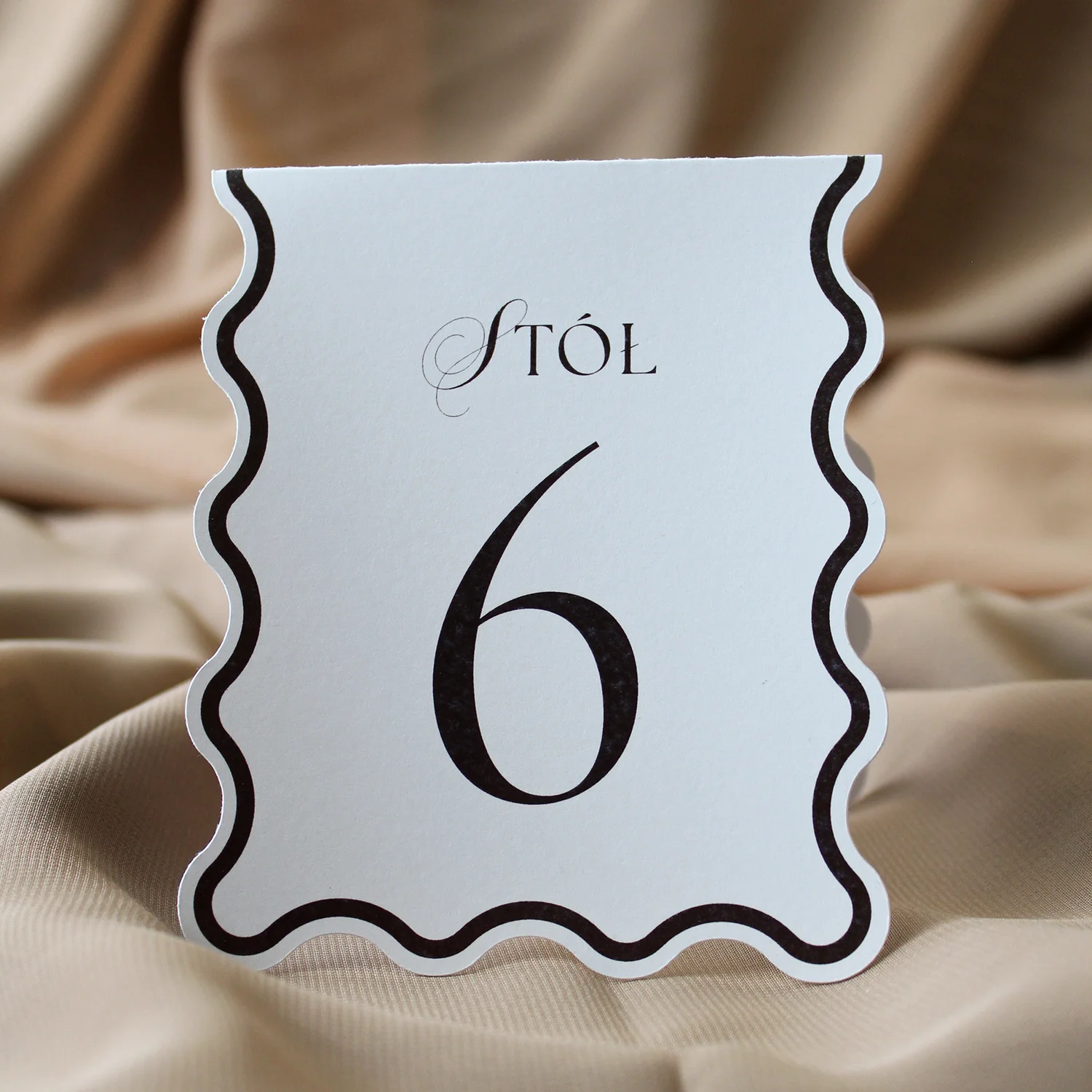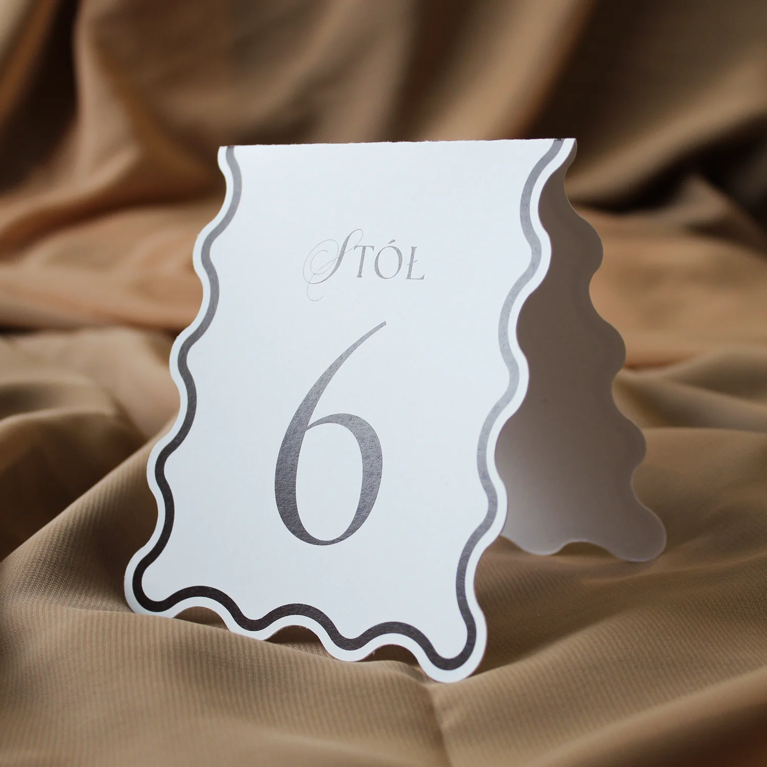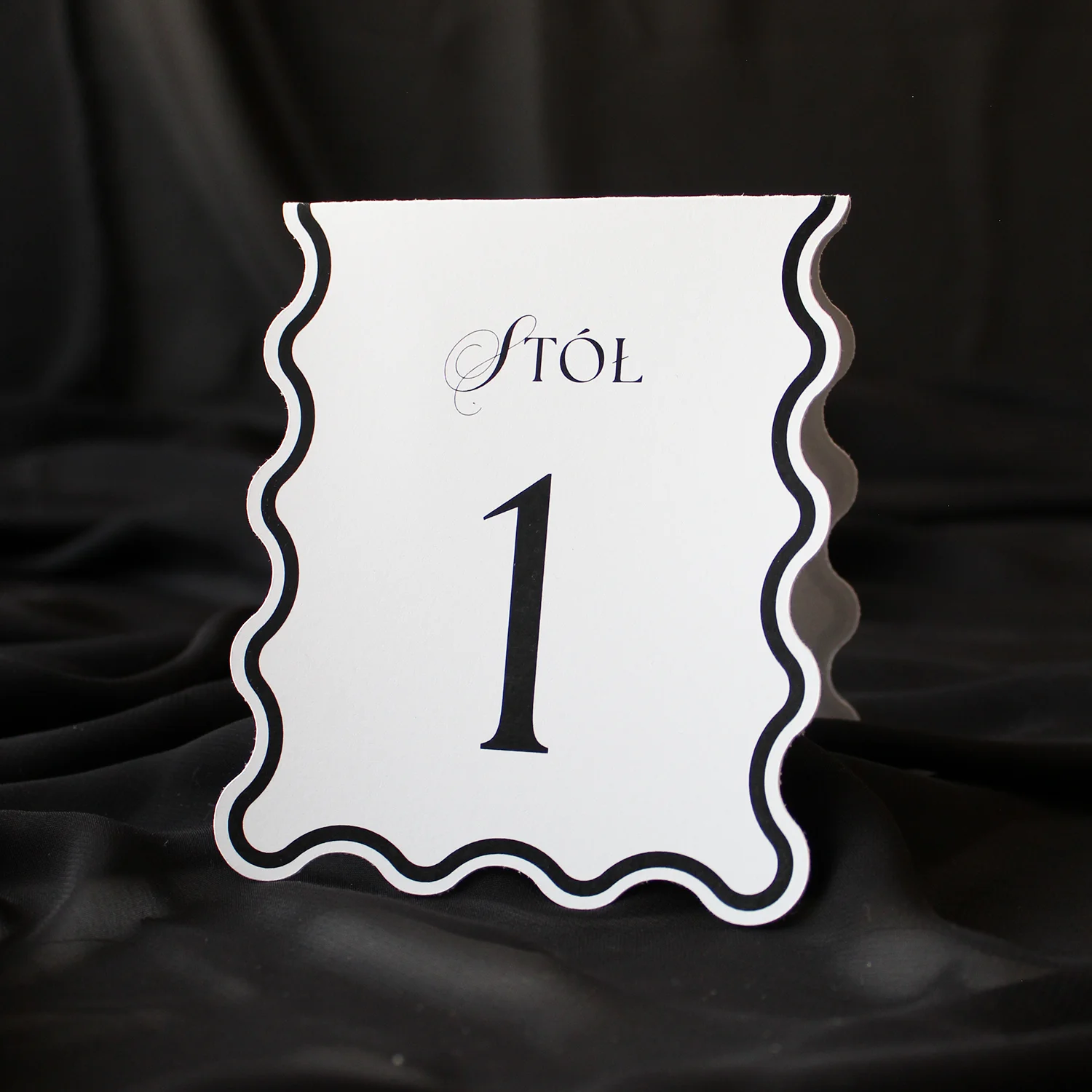 Stojące numery stołów z kolekcji Wave to elegancki detal, który wyróżnia się oryginalnym falistym kształtem i dopracowaną typografią. Stylowy wygląd kart doskonale komponuje się z pozostałymi elementami kolekcji, a czytelne oznaczenia ułatwiają gościom odnalezienie swojego miejsca przy stole.
