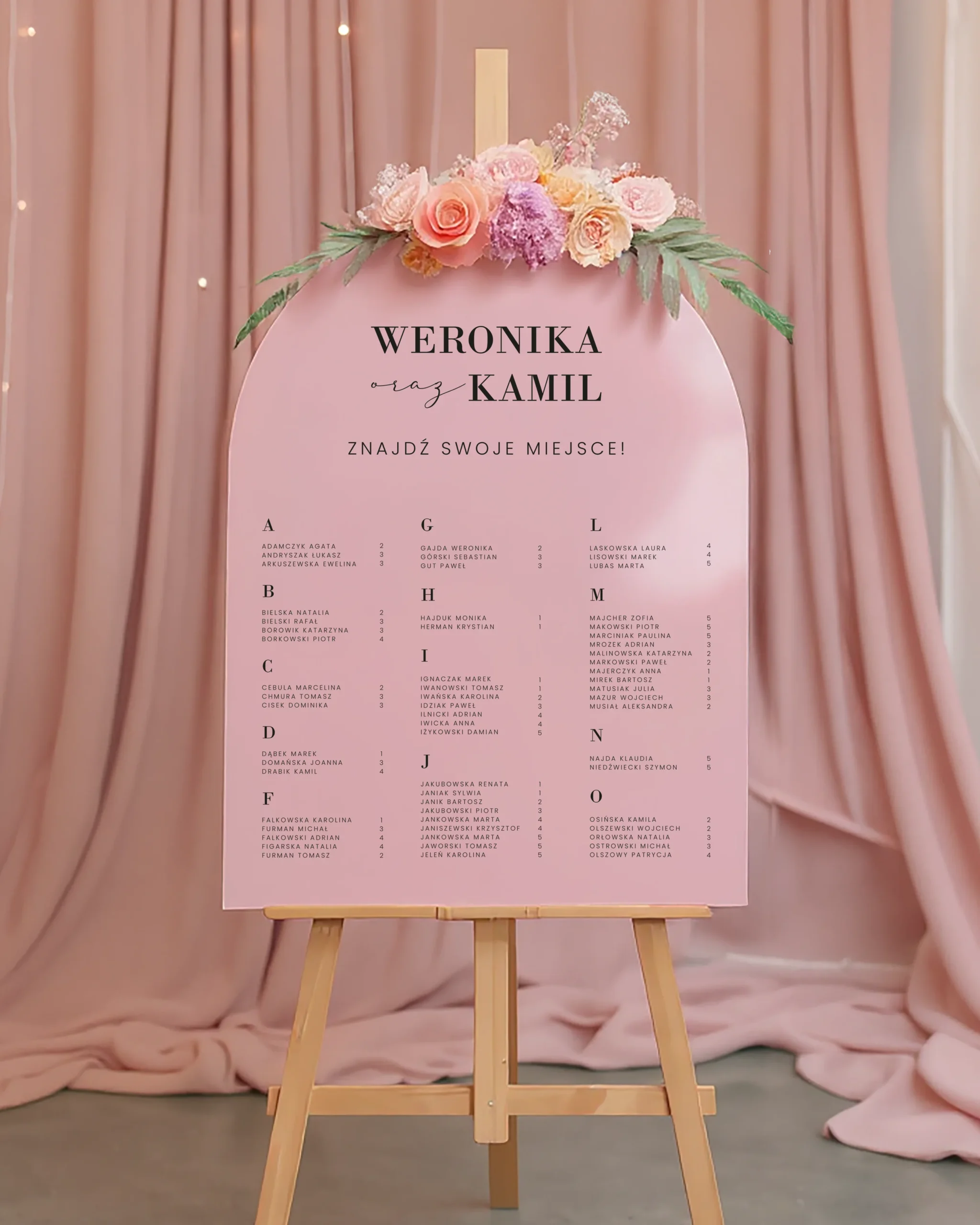 Plan układamy na podstawie przesłanej listy gości – jeśli zostanie podzielona na stoły, rozkład będzie według stołów. Jeśli goście będą podani w kolejności alfabetycznej, przygotujemy plan w wersji alfabetycznej.