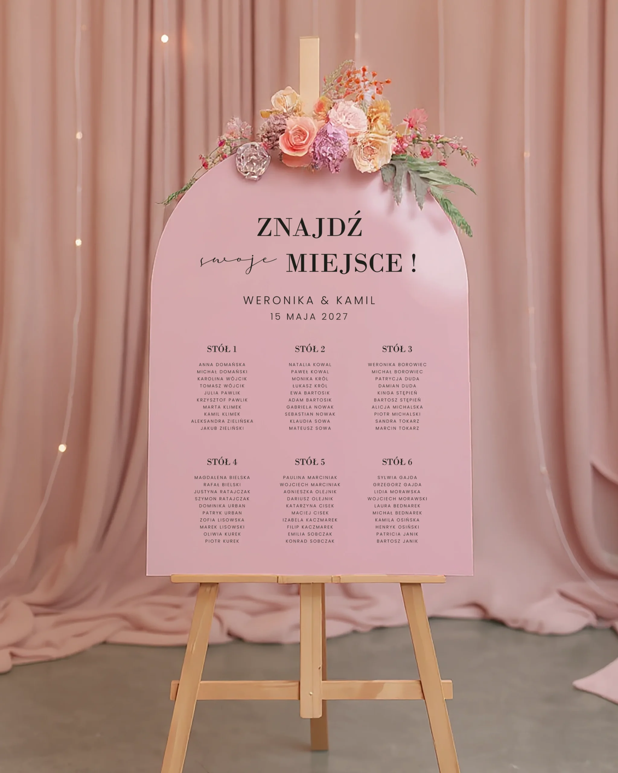 Plan stołów Arch to efektowna dekoracja, która od razu przyciąga wzrok gości. Nowoczesny kształt łuku, malowane tło i starannie dopracowana typografia tworzą spójną, elegancką całość, która pięknie prezentuje się przy wejściu na salę lub obok tablicy powitalnej z tej samej kolekcji.