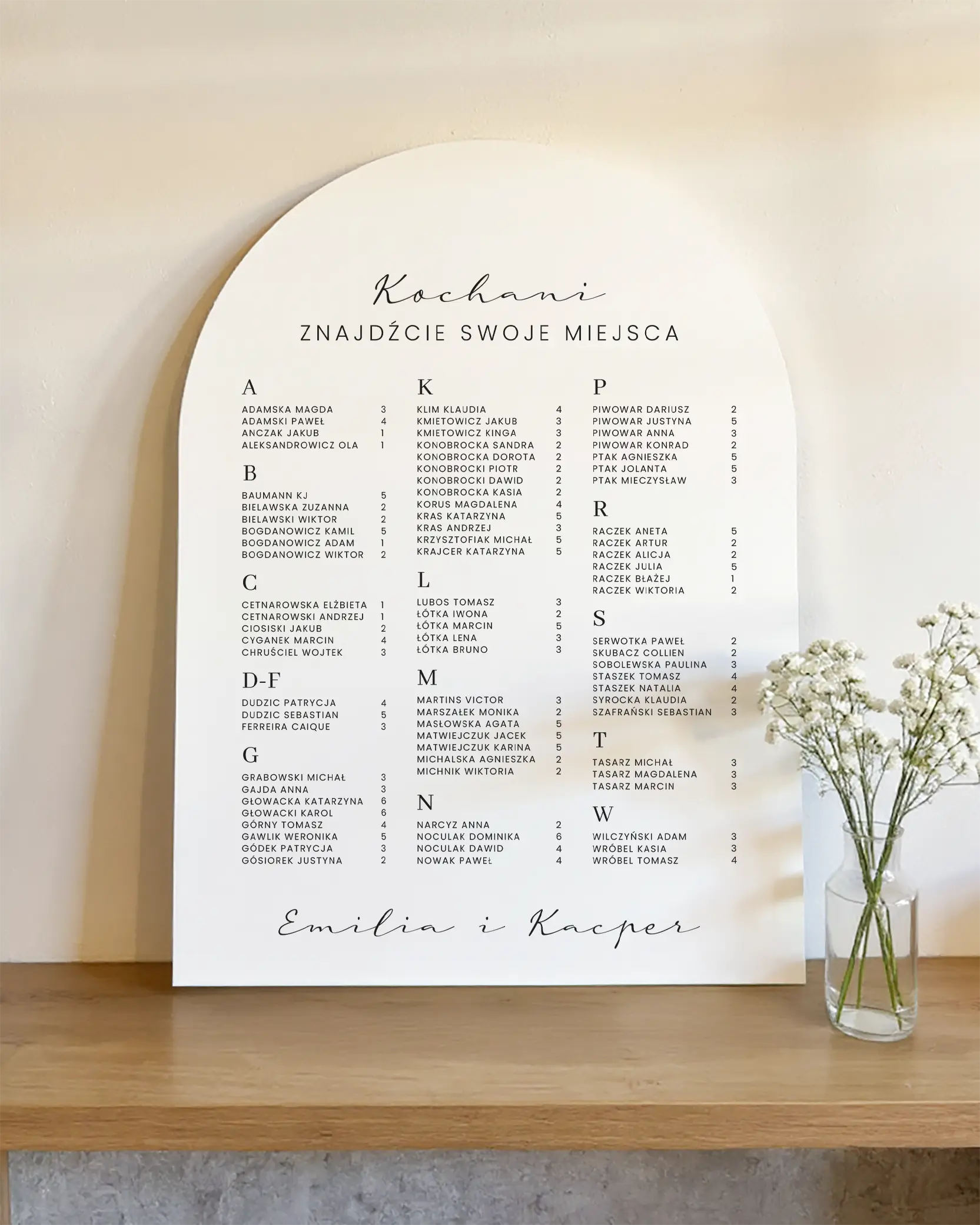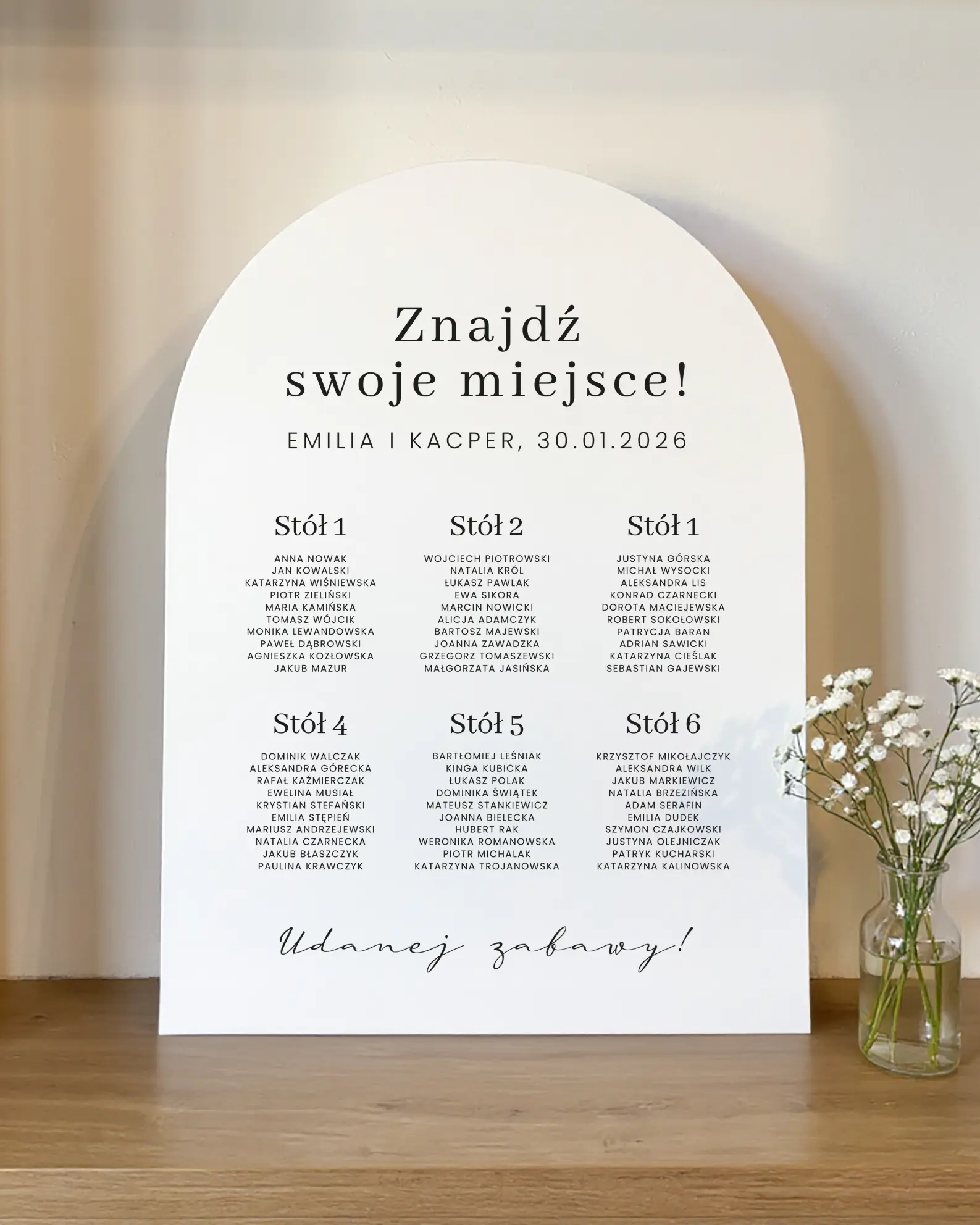 Plan układamy na podstawie przesłanej listy gości – jeśli zostanie podzielona na stoły, rozkład będzie według stołów. Jeśli goście będą podani w kolejności alfabetycznej, przygotujemy plan w wersji alfabetycznej.