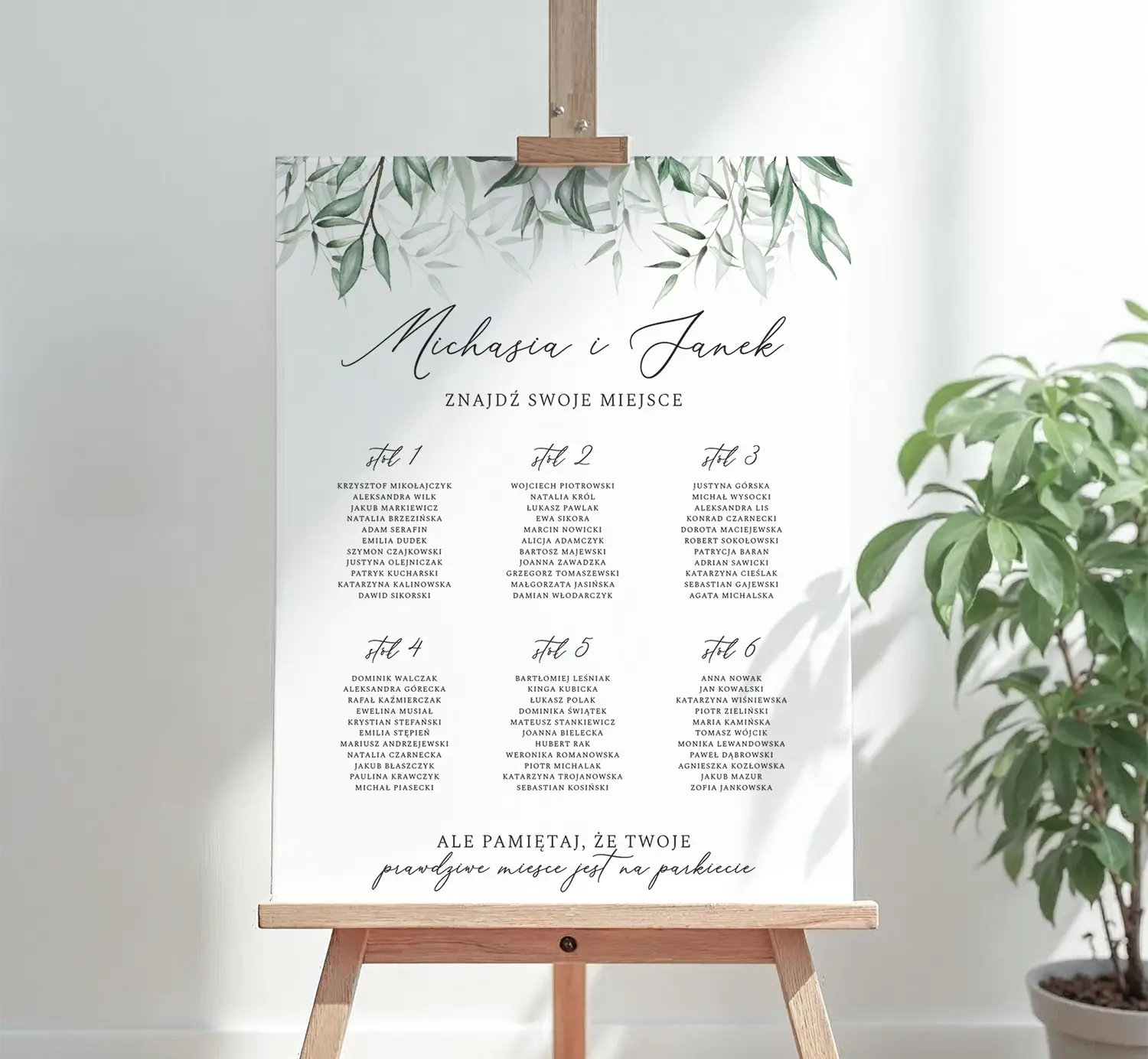Stylowy plan stołów Green to nie tylko praktyczny element organizacyjny, ale także wyjątkowa dekoracja, która idealnie komponuje się z naturalnym wystrojem sali weselnej. Delikatne zielone gałązki nadają mu lekkości i świeżości, wprowadzając subtelną harmonię do aranżacji uroczystości.