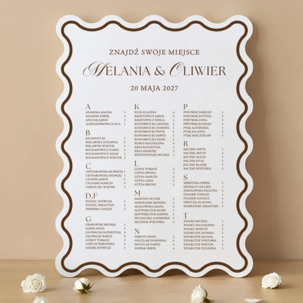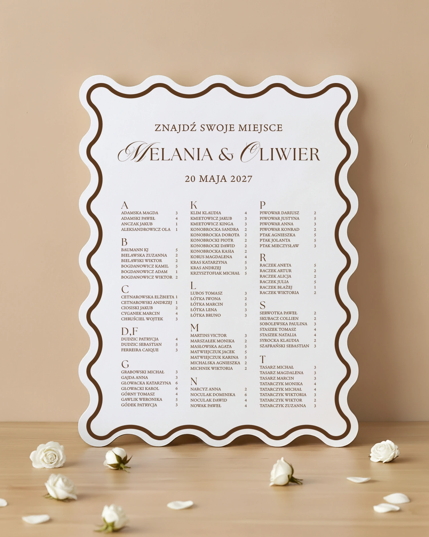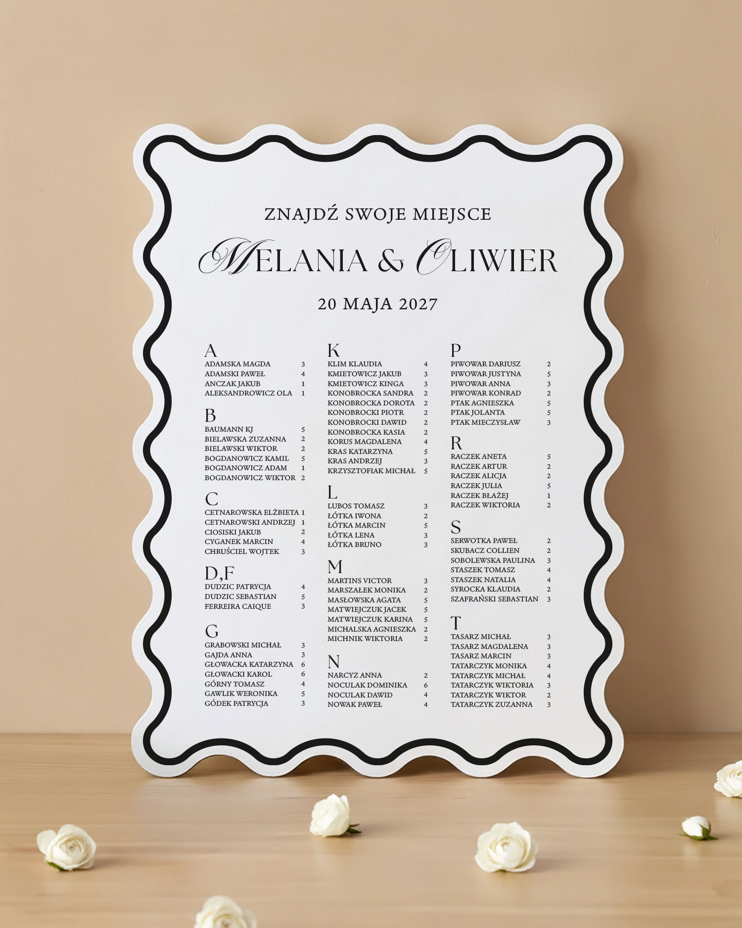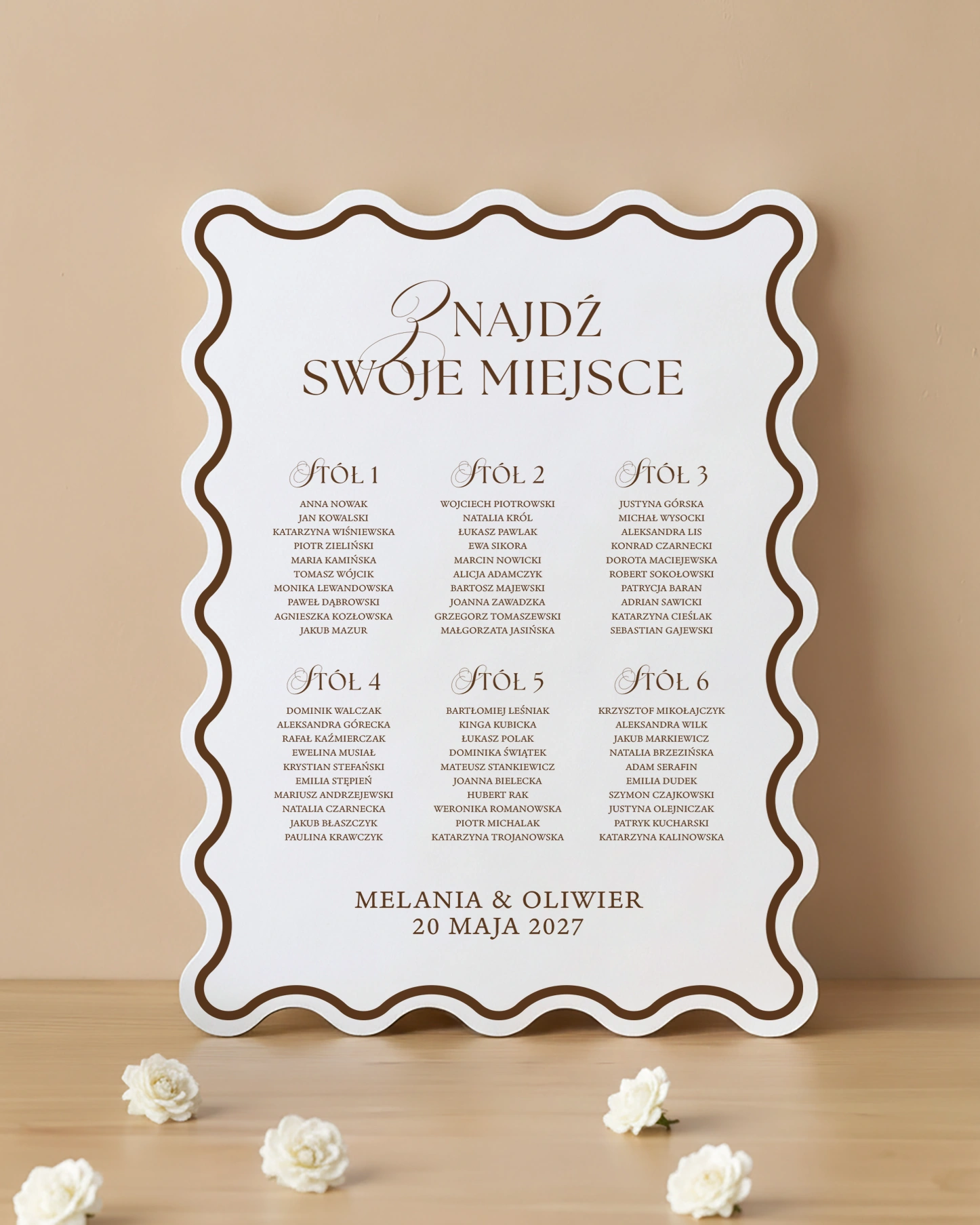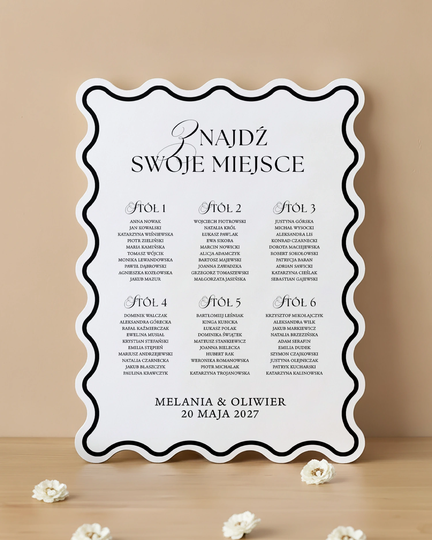 To rozwiązanie, które pomaga gościom odnaleźć swoje miejsce w sposób naturalny i intuicyjny. Zaprojektowany z myślą o spójności wizualnej z innymi elementami kolekcji, doskonale komponuje się z winietkami, menu i zaproszeniami w tym samym stylu.