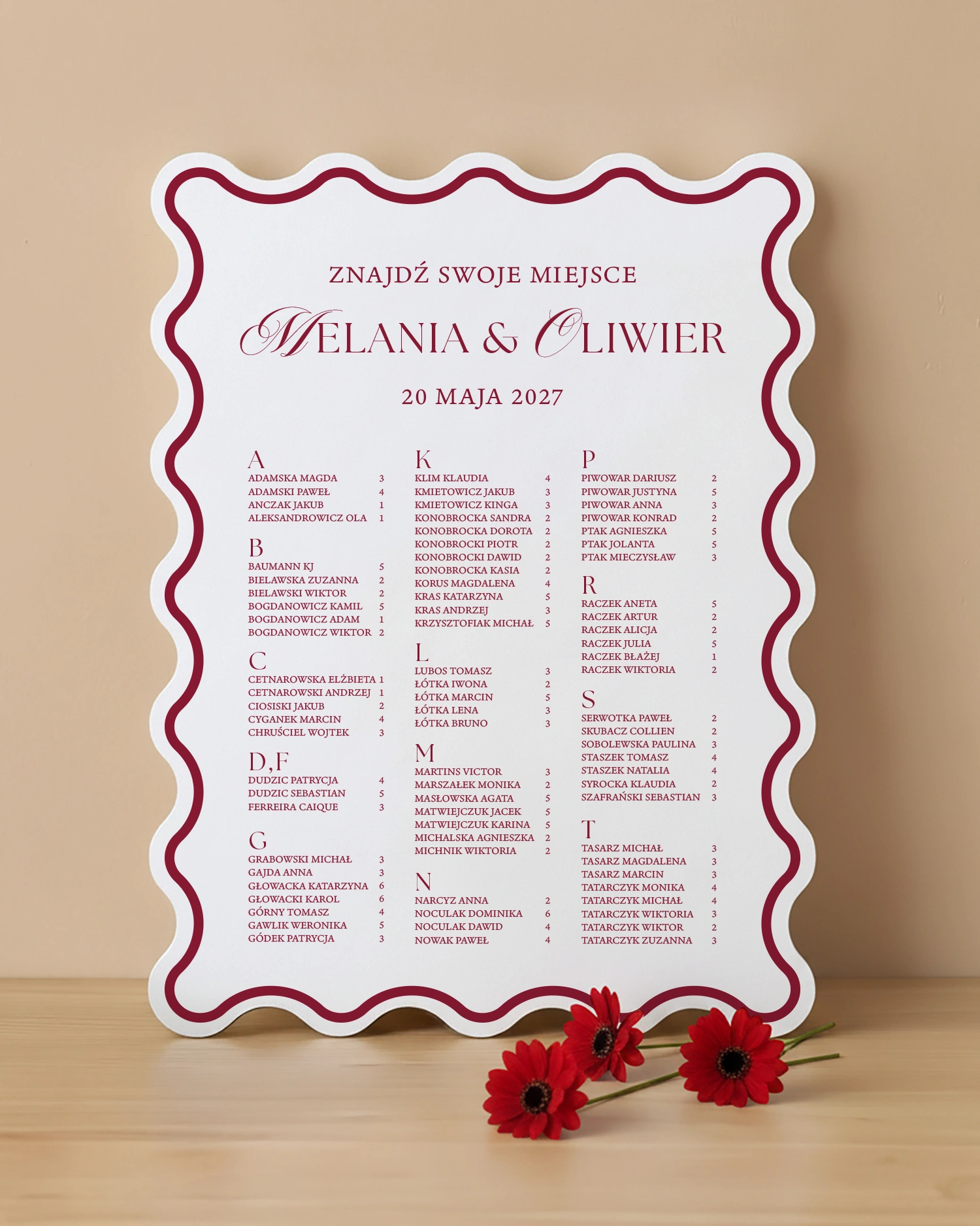 Plan układamy na podstawie przesłanej listy gości – jeśli zostanie podzielona na stoły, rozkład będzie według stołów. Jeśli goście będą podani w kolejności alfabetycznej, przygotujemy plan w wersji alfabetycznej.