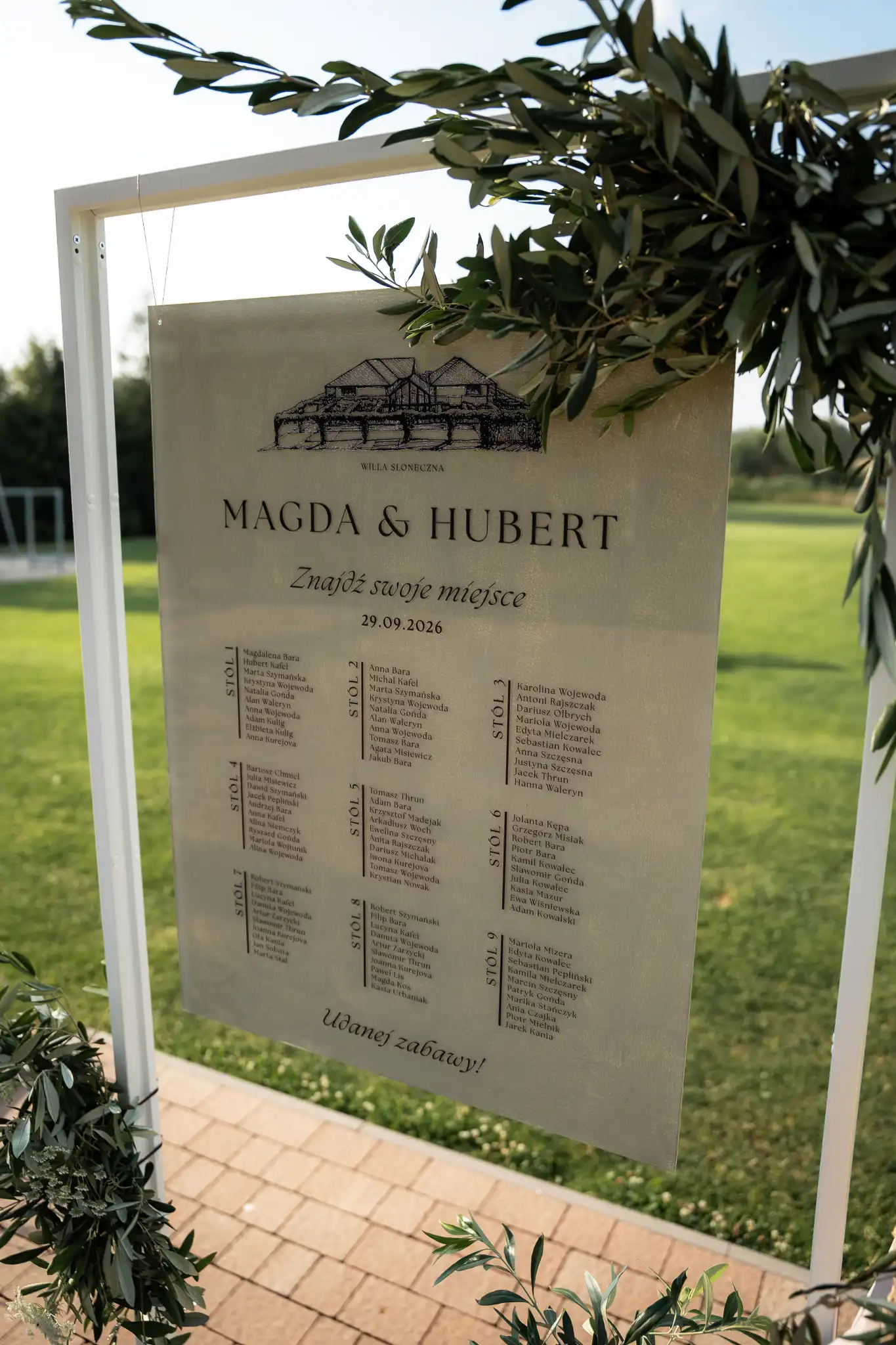 Czarne napisy na planie są wyraźne i czytelne, co ułatwia gościom odnalezienie swojego miejsca przy stole. Dzięki wymiarom 80×60 cm, plan jest wystarczająco widoczny, aby przyciągać uwagę, ale jednocześnie nie zajmuje zbyt dużo miejsca. Dodatkowym atutem jest piękny rysunek Willi Słoneczna, który dodaje charakteru i podkreśla unikalność Twojego wydarzenia.