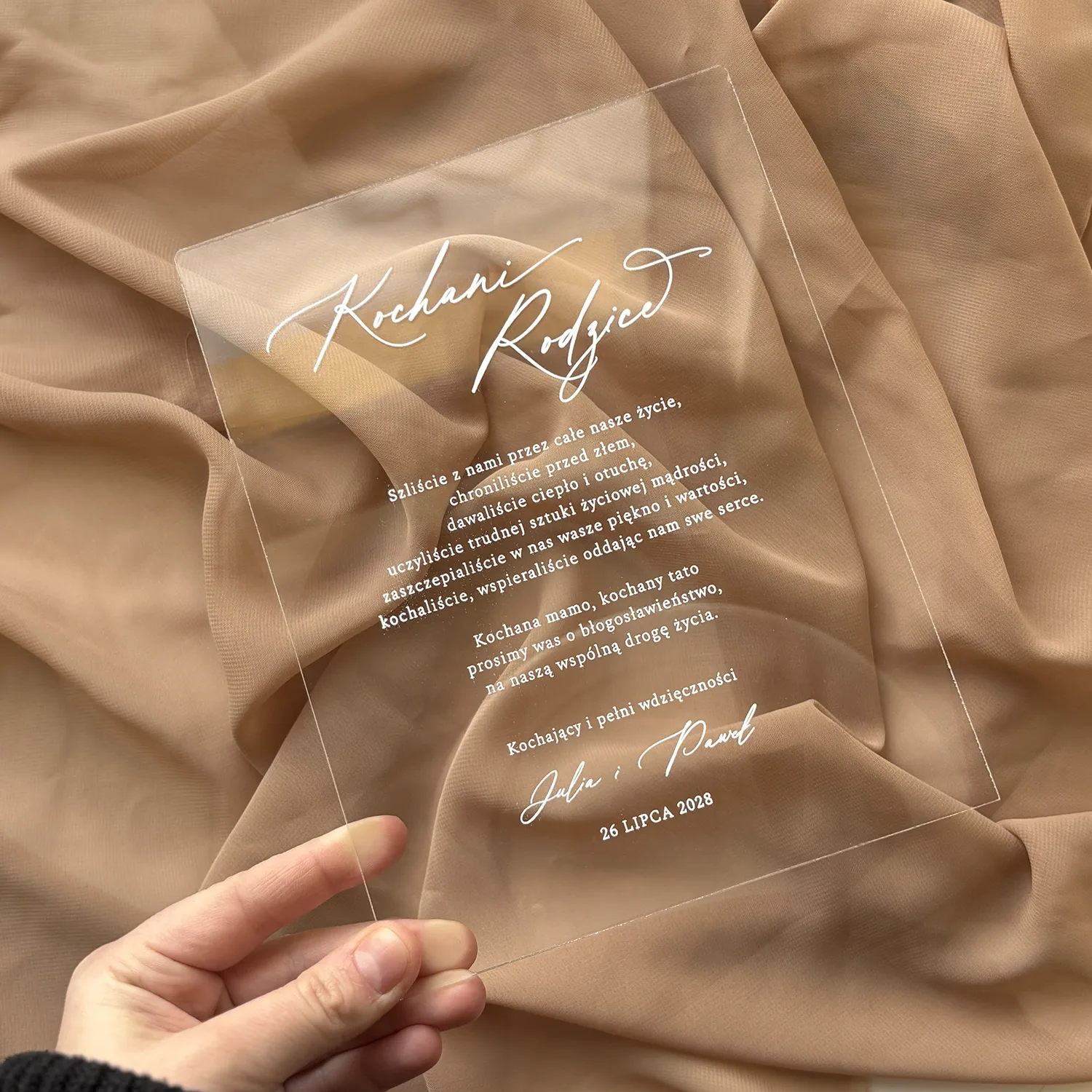 Prośba o błogosławieństwo wykonana na transparentnej plexi to nowoczesna i elegancka alternatywa dla tradycyjnych kartek. Biały nadruk pięknie prezentuje się na przezroczystej plexi, a minimalistyczna typografia nadaje całości ponadczasowy charakter. Projekt obejmuje personalizację imion oraz daty ślubu, dzięki czemu całość jest spójna z oprawą uroczystości.