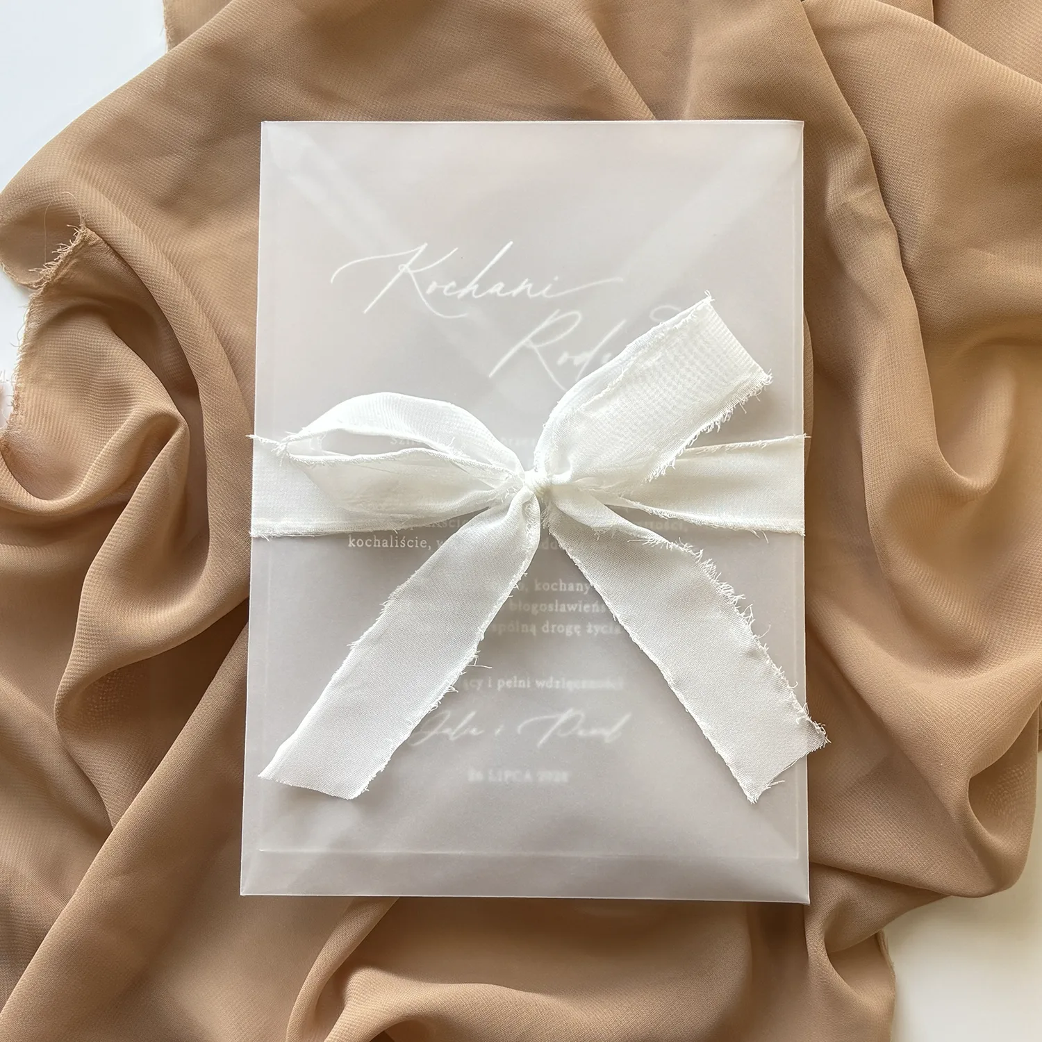 Każda prośba o błogosławieństwo umieszczona jest w półtransparentnej kopercie z kalki i przewiązana miękkim szyfonem. To dopracowany detal, który podkreśla wyjątkowy charakter chwili, ale pozostaje subtelny i estetyczny. Idealna propozycja dla par, które cenią nowoczesne rozwiązania i elegancką formę.