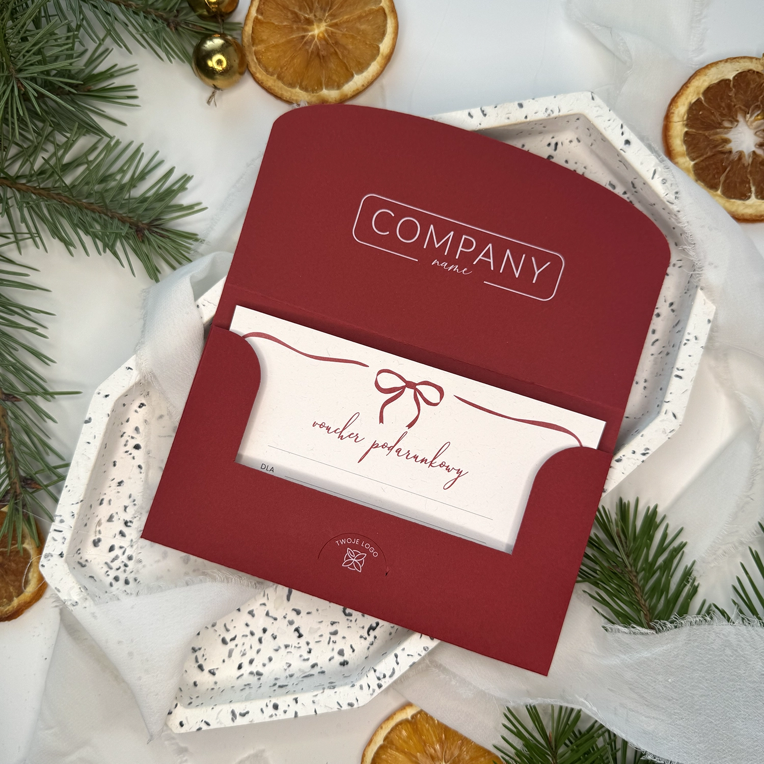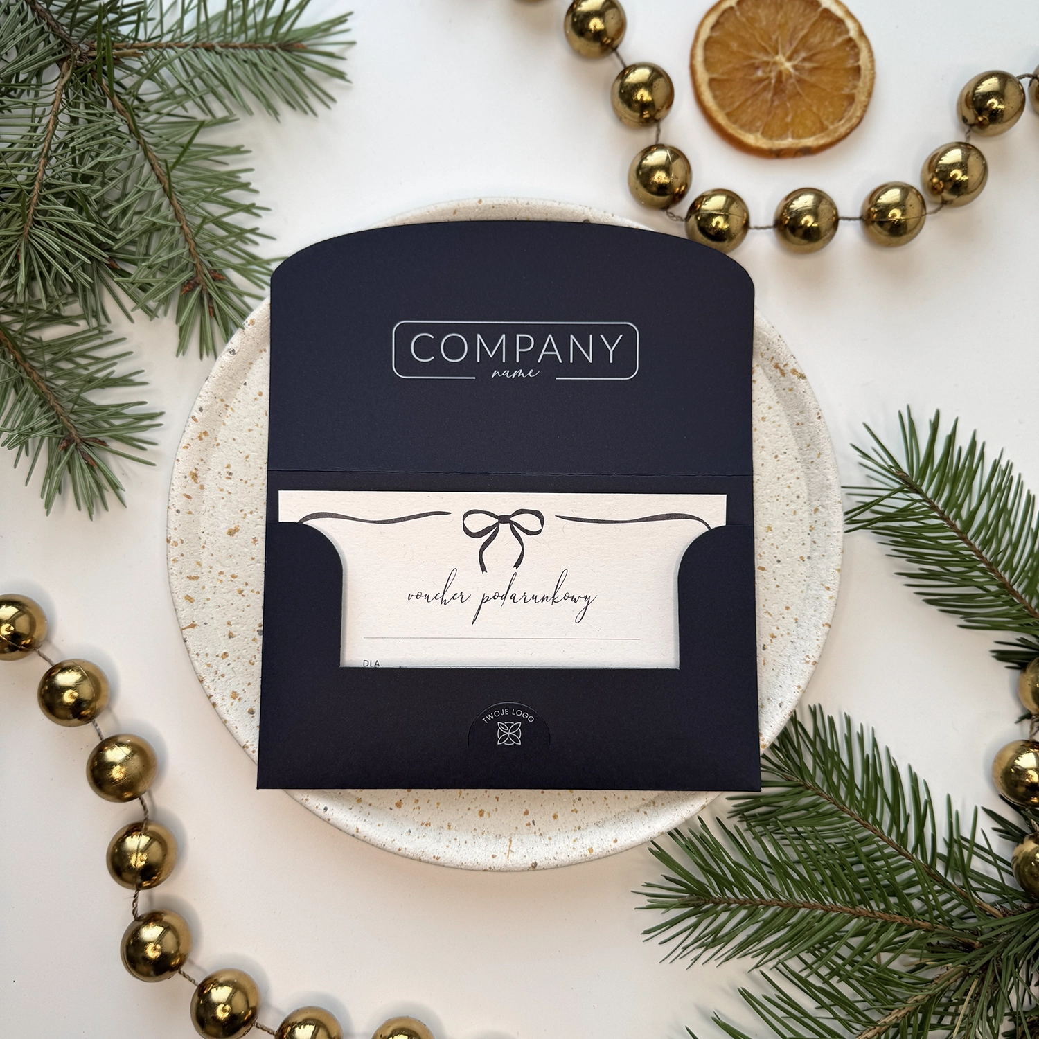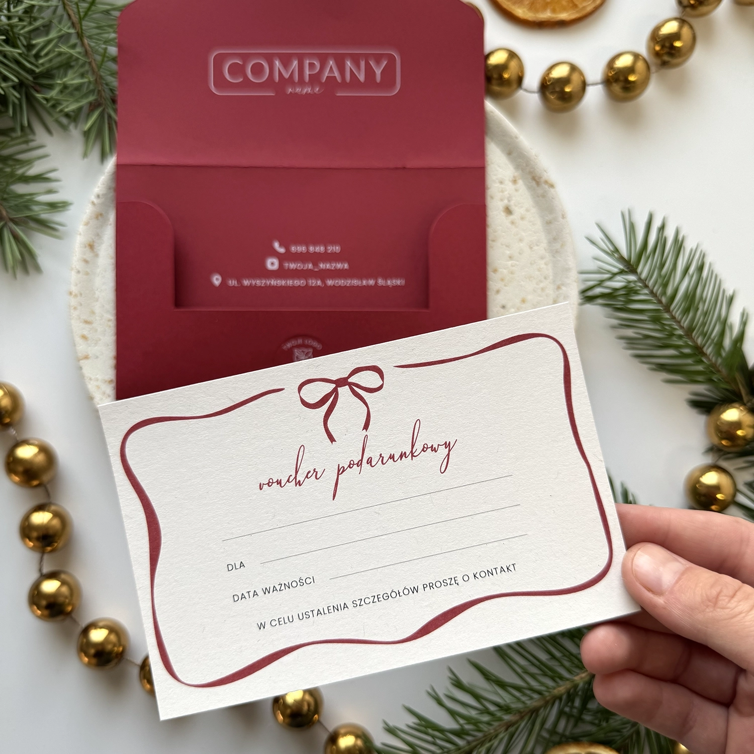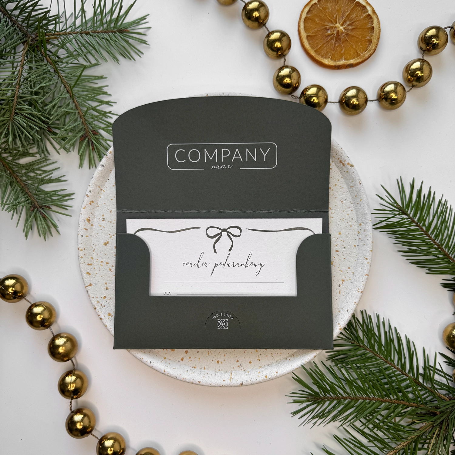 Elegancki Świąteczny voucher z kokardką to subtelna, a zarazem efektowna forma prezentu, która świetnie sprawdzi się w ofercie firm usługowych. Stylowe etui z delikatną kokardką i miejscem na logo marki tworzy spójną, profesjonalną oprawę dla bonu podarunkowego.