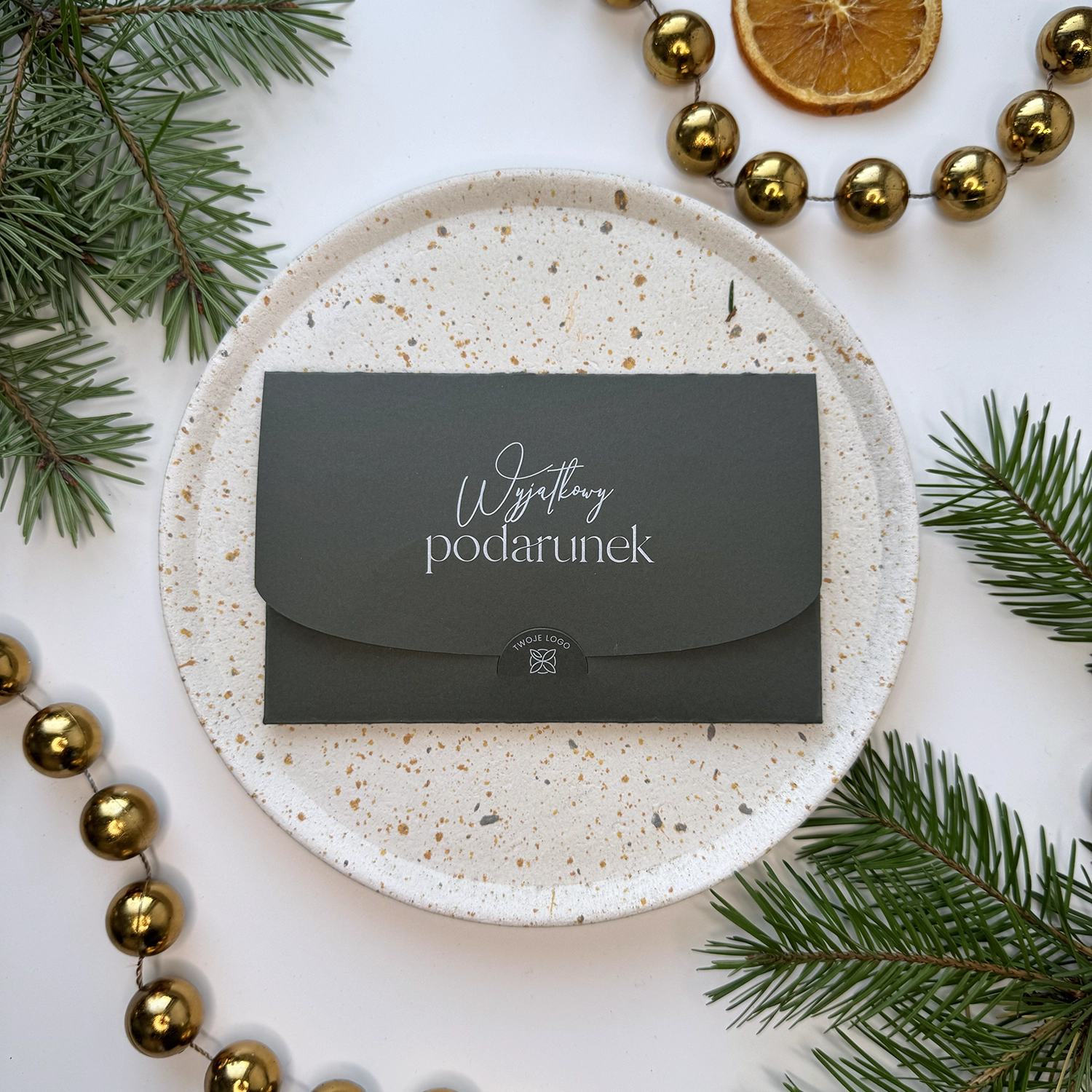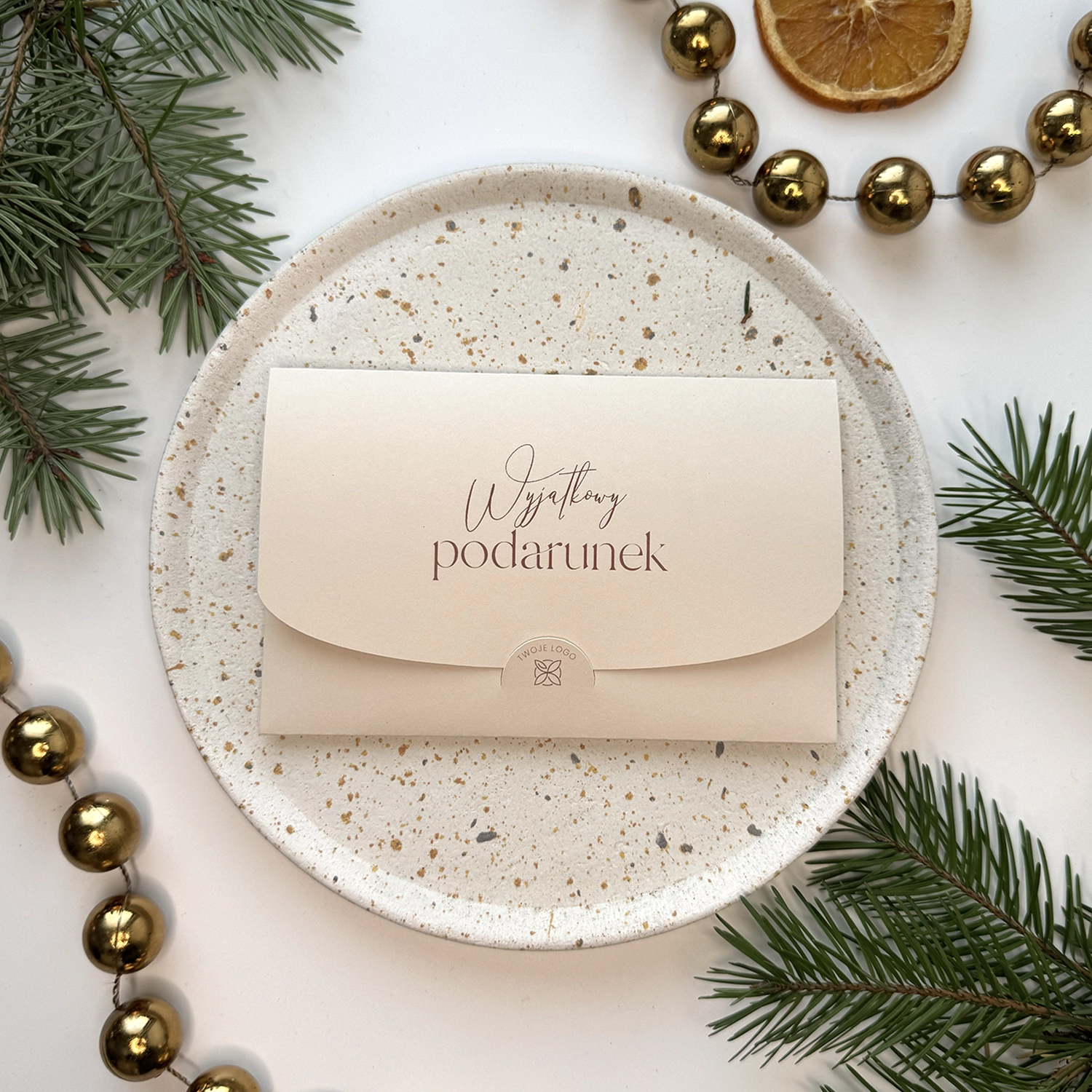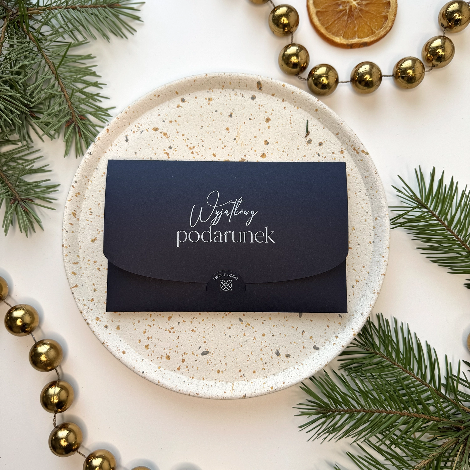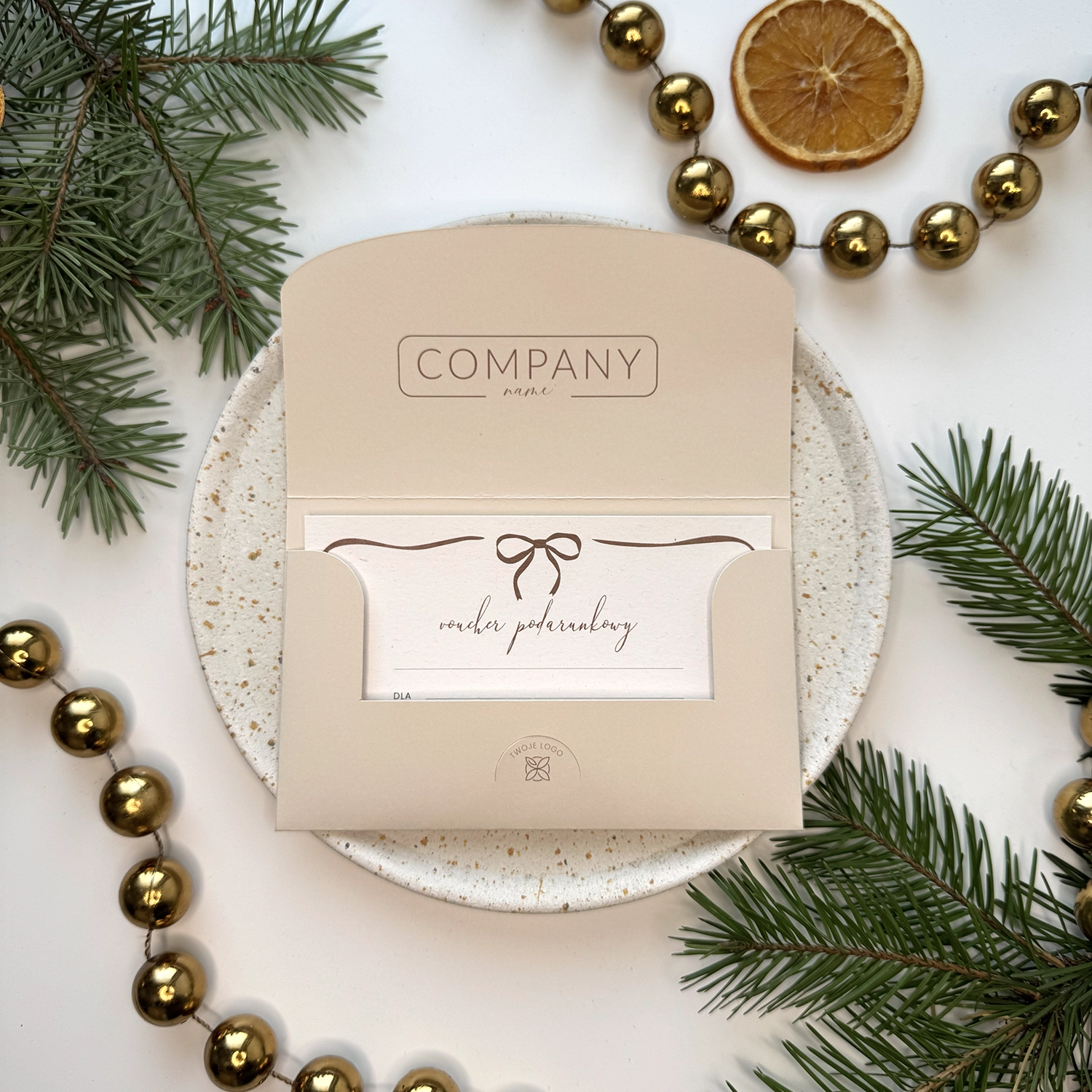 Elegancki Świąteczny voucher z kokardką to subtelna, a zarazem efektowna forma prezentu, która świetnie sprawdzi się w ofercie firm usługowych. Stylowe etui z delikatną kokardką i miejscem na logo marki tworzy spójną, profesjonalną oprawę dla bonu podarunkowego.