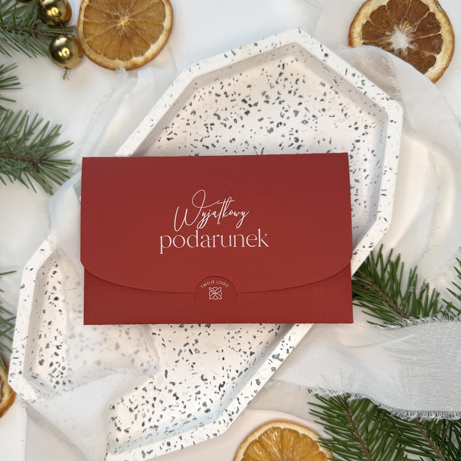 Wewnątrz znajduje się karta z miejscem na wpisanie szczegółów oferty — gotowa do personalizacji według potrzeb Twoich klientów. Voucher dostępny w czterech klasycznych kolorach, dzięki czemu dopasujesz go do wizerunku swojej marki.