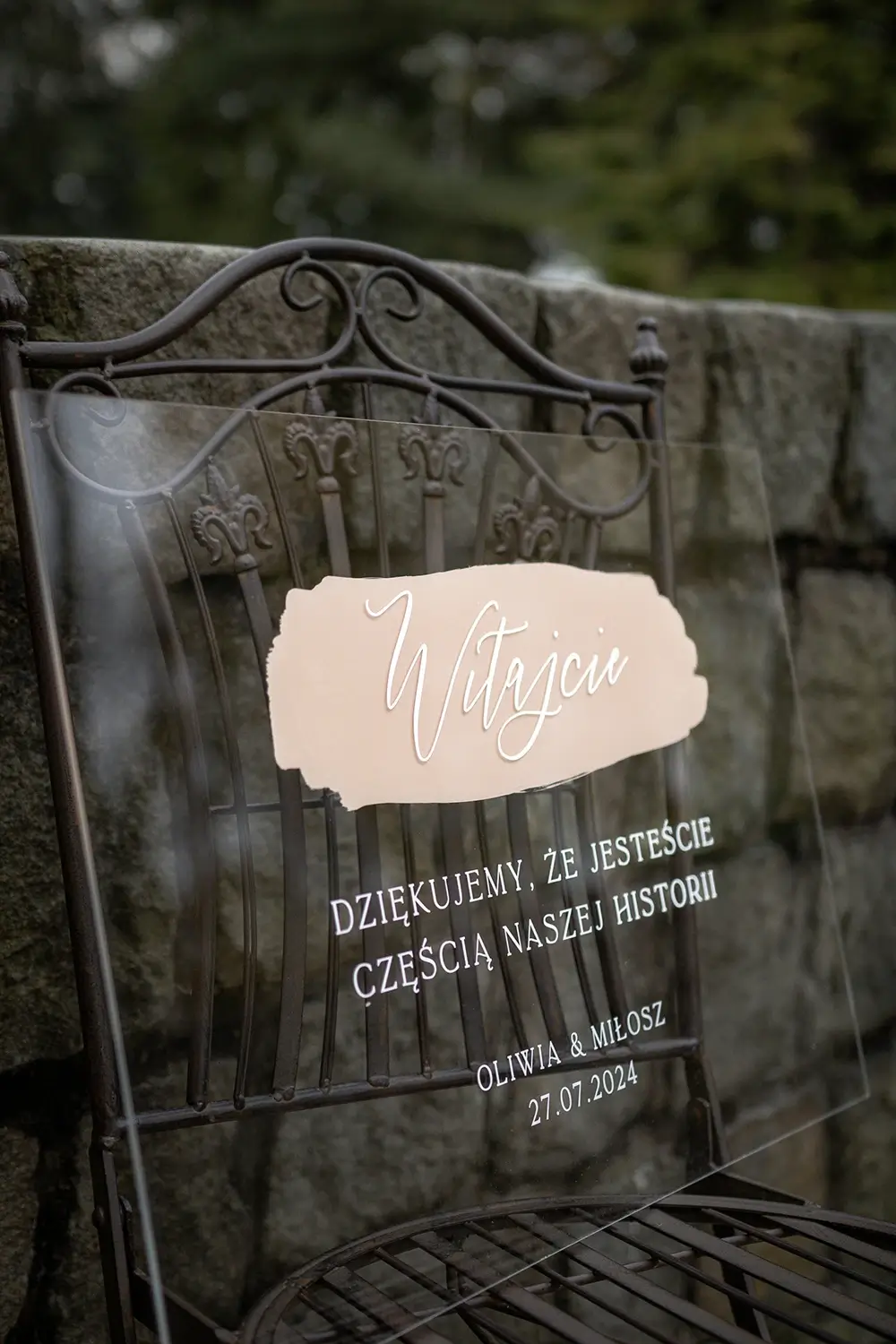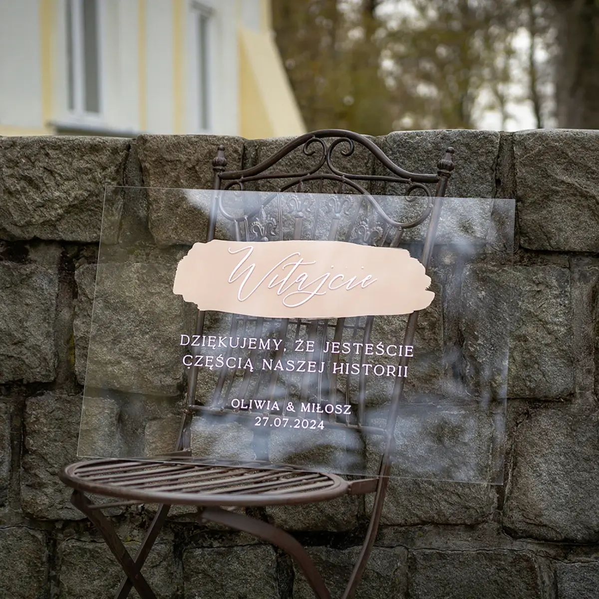 Tablica powitalna Glixia to nowoczesny i elegancki sposób na powitanie gości na Waszym ślubie. Wykonana z przezroczystej pleksi, wyróżnia się minimalistycznym designem i delikatnym, ręcznie malowanym akcentem w odcieniu beżu. Subtelne, białe napisy tworzą efektowną całość, nadając przyjęciu wyjątkowy charakter. Dzięki swojej estetyce tablica doskonale pasuje do nowoczesnych, boho oraz romantycznych aranżacji.