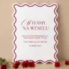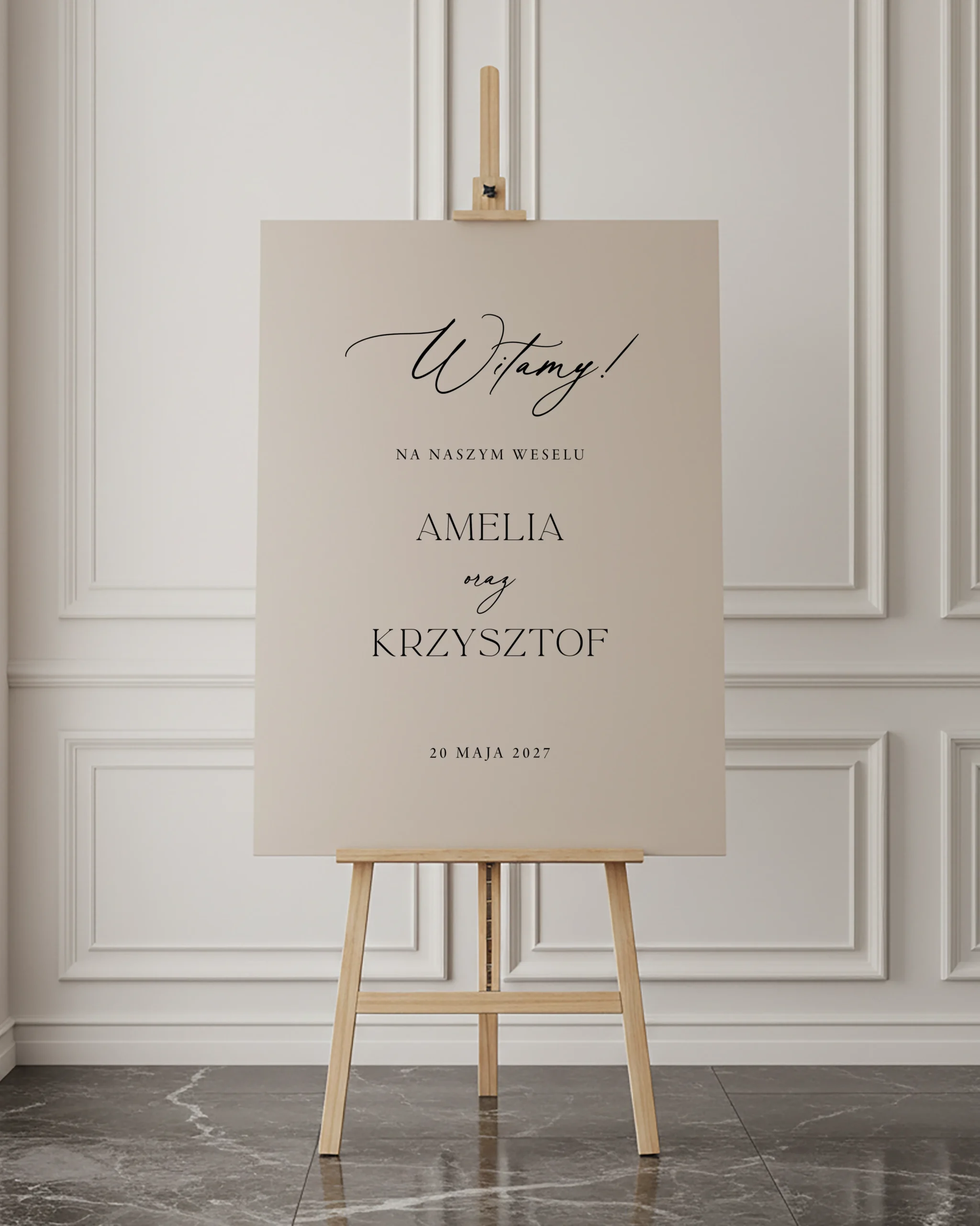 Tablica powitalna utrzymana jest w stonowanej, kremowej kolorystyce i prostej formie, która dobrze wpisuje się w klasyczną oprawę sali. Czytelny układ tekstu oraz spokojna typografia sprawiają, że całość prezentuje się schludnie i uporządkowanie, bez zbędnych elementów graficznych.