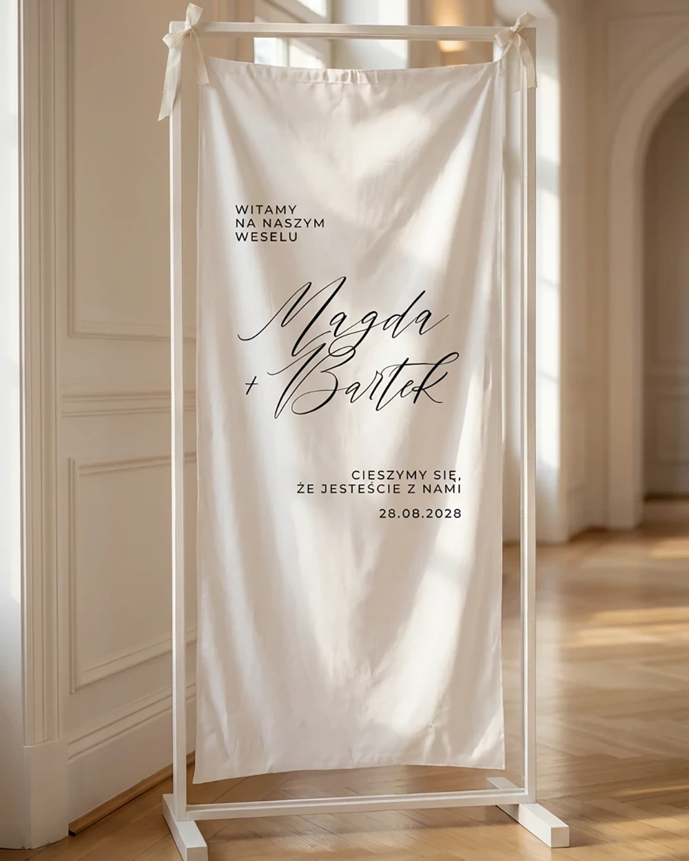 Subtelna, materiałowa tablica powitalna to piękny sposób na przywitanie gości w dniu ślubu. Lekka, zwiewna forma doskonale prezentuje się zarówno przy wejściu do sali, jak i w plenerowej scenerii. To wyjątkowy dodatek, który podkreśli styl całej uroczystości i wprowadzi gości w jej klimat już od pierwszych chwil.