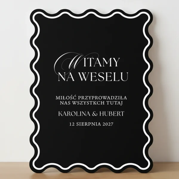 Tablica powitalna z kolekcji Wave Classic to elegancki dodatek, który uzupełnia aranżację sali i sprawia, że goście od początku czują się mile widziani. Klasyczna forma z falistym obramowaniem przyciąga wzrok i dobrze prezentuje się zarówno solo, jak i w zestawieniu z kwiatami lub świecami.