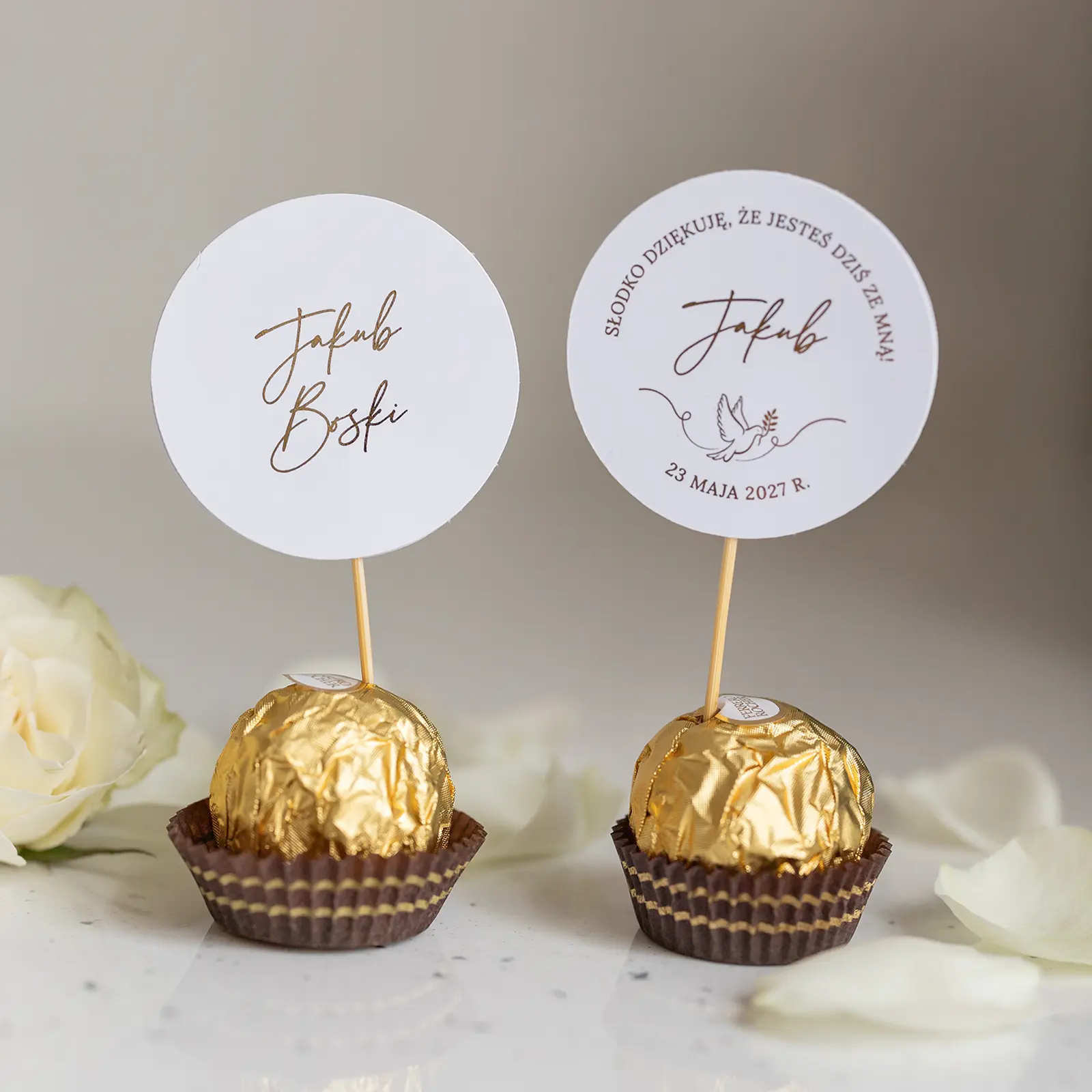 Winietki na komunię z kolekcji Ferrero Rocher to subtelna i elegancka dekoracja stołu, która jednocześnie pełni funkcję oznaczenia miejsc. Sprzedajemy samą dwustronną winietkę z patyczkiem, bez cukierka. Z jednej strony umieszczone jest imię i nazwisko gościa, a z drugiej kilka słów podziękowania. Minimalistyczny styl i delikatna forma sprawiają, że doskonale komponują się z uroczystym charakterem przyjęcia. Można je łatwo umieścić w pralince lub innej słodkości według własnego pomysłu.