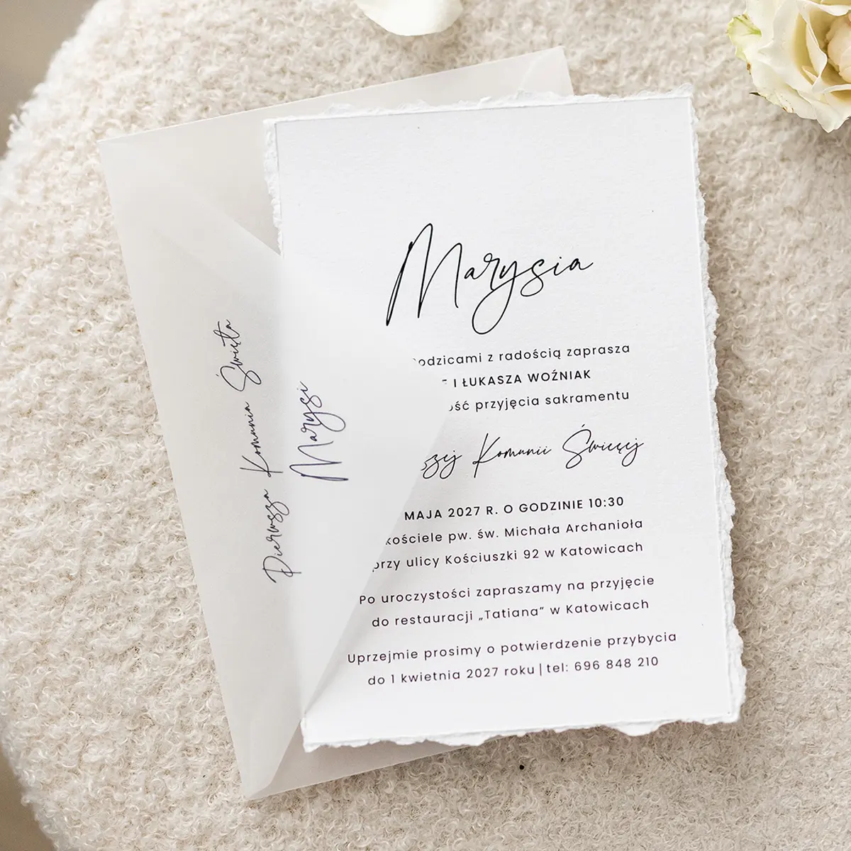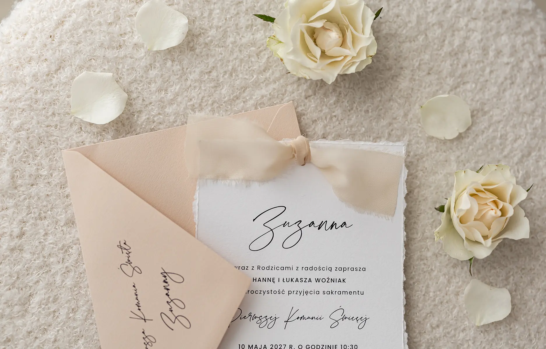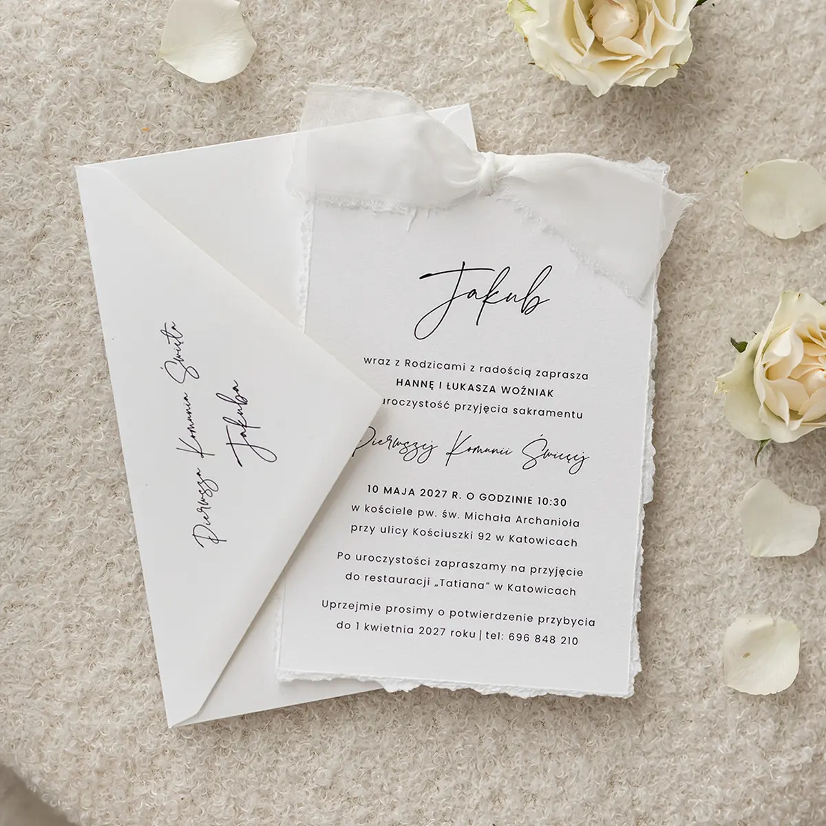 Eleganckie zaproszenia na komunię, które łączą klasyczną prostotę z delikatnymi akcentami. Wykonane z wysokiej jakości papieru o ręcznie rwanych brzegach, zachwycają subtelnością i starannością wykonania. Możesz wybrać wersję z lekką, szyfonową wstążką lub postawić na minimalistyczny wariant bez niej.