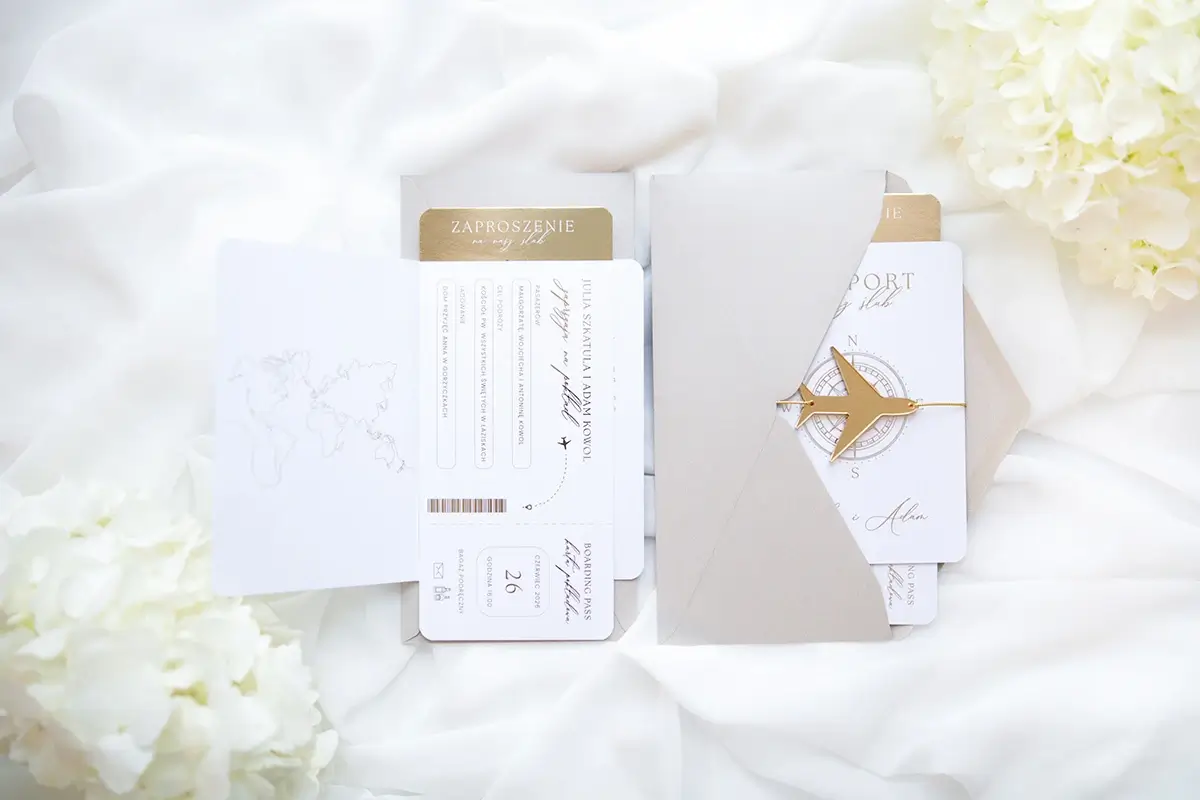 Złoty dodatek w postaci zawieszki w kształcie samolotu na delikatnym sznurku dodaje elegancji i podkreśla wyjątkowy charakter zaproszeń. Zaproszenia umieszczone są w stylowych kopertach w neutralnych, eleganckich odcieniach, co dodatkowo podkreśla ich unikalny styl.