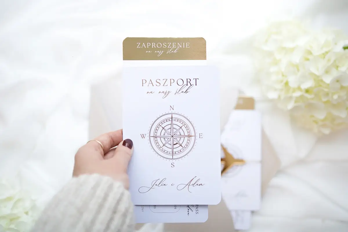 Każde zaproszenie przypomina prawdziwy paszport – z okładką ozdobioną motywem róży wiatrów, subtelną mapą świata oraz eleganckimi, personalizowanymi szczegółami. Środek zaproszenia zawiera spersonalizowane informacje dotyczące uroczystości, takie jak data, miejsce oraz szczegóły organizacyjne, w estetycznym układzie graficznym, który zachwyci każdego.