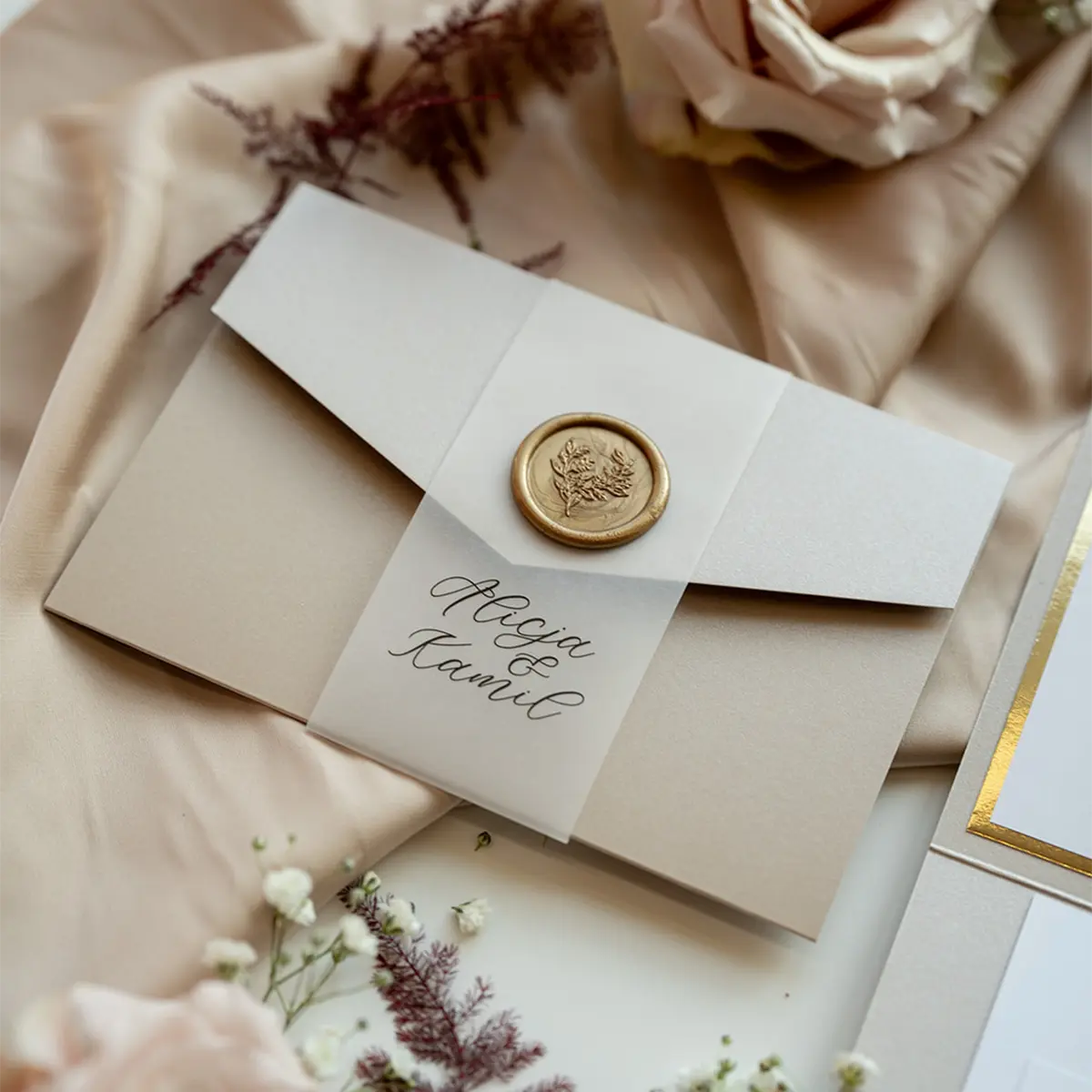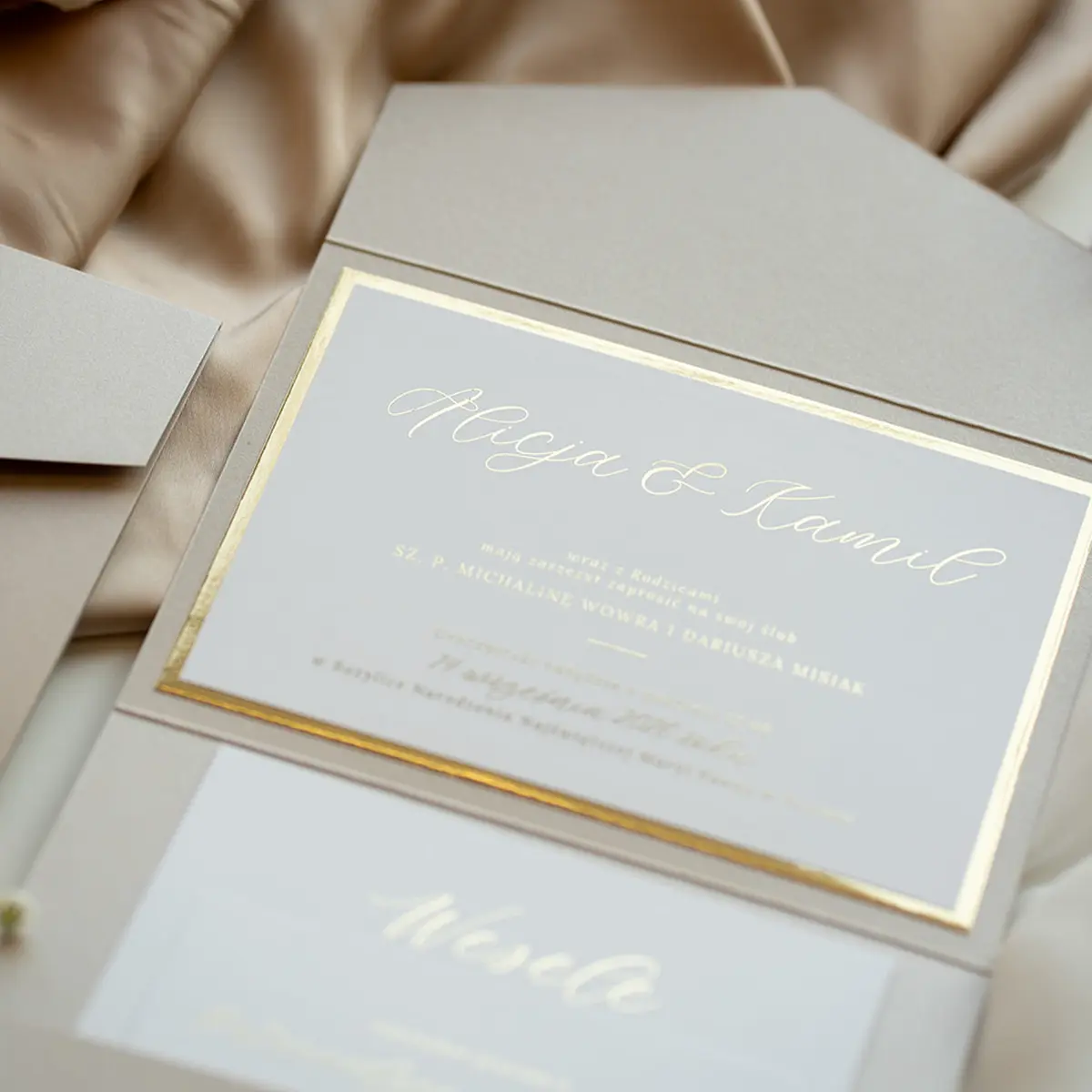 Zaproszenie ślubne Złoty Folder to nowoczesny wybór, który łączy elegancję z oryginalnym stylem. Złote akcenty nadają mu luksusowego charakteru, idealnego na wyjątkową ceremonię. Wykonane z wysokiej jakości papieru, zaproszenie przyciąga wzrok swoją prostotą oraz starannym wykonaniem. Dzięki swojej estetyce doskonale wpisuje się w różnorodne motywy weselne, wprowadzając elegancki akcent do najważniejszego dnia w życiu pary.