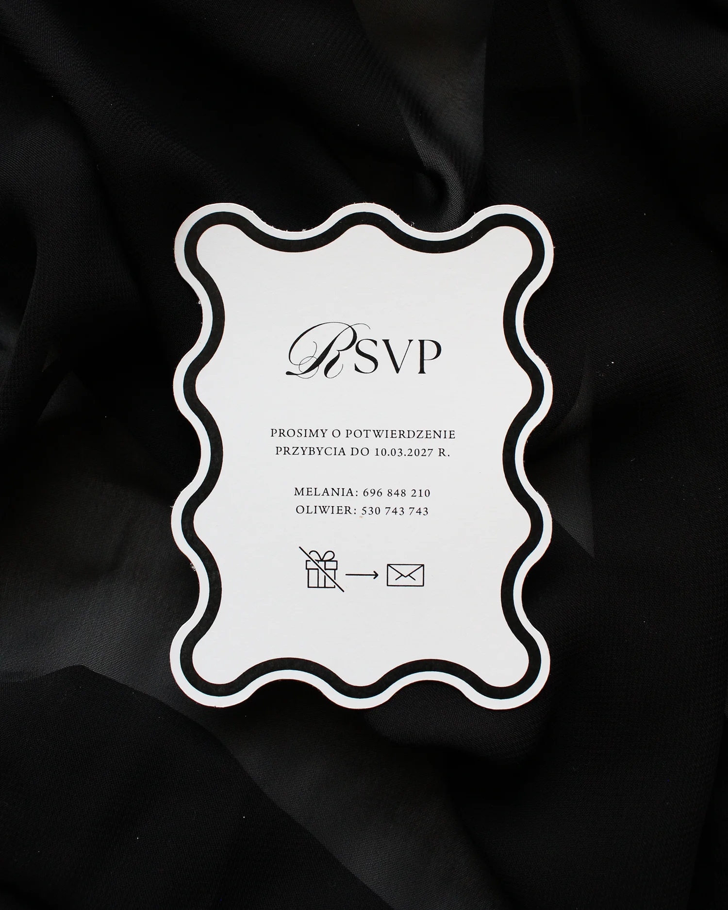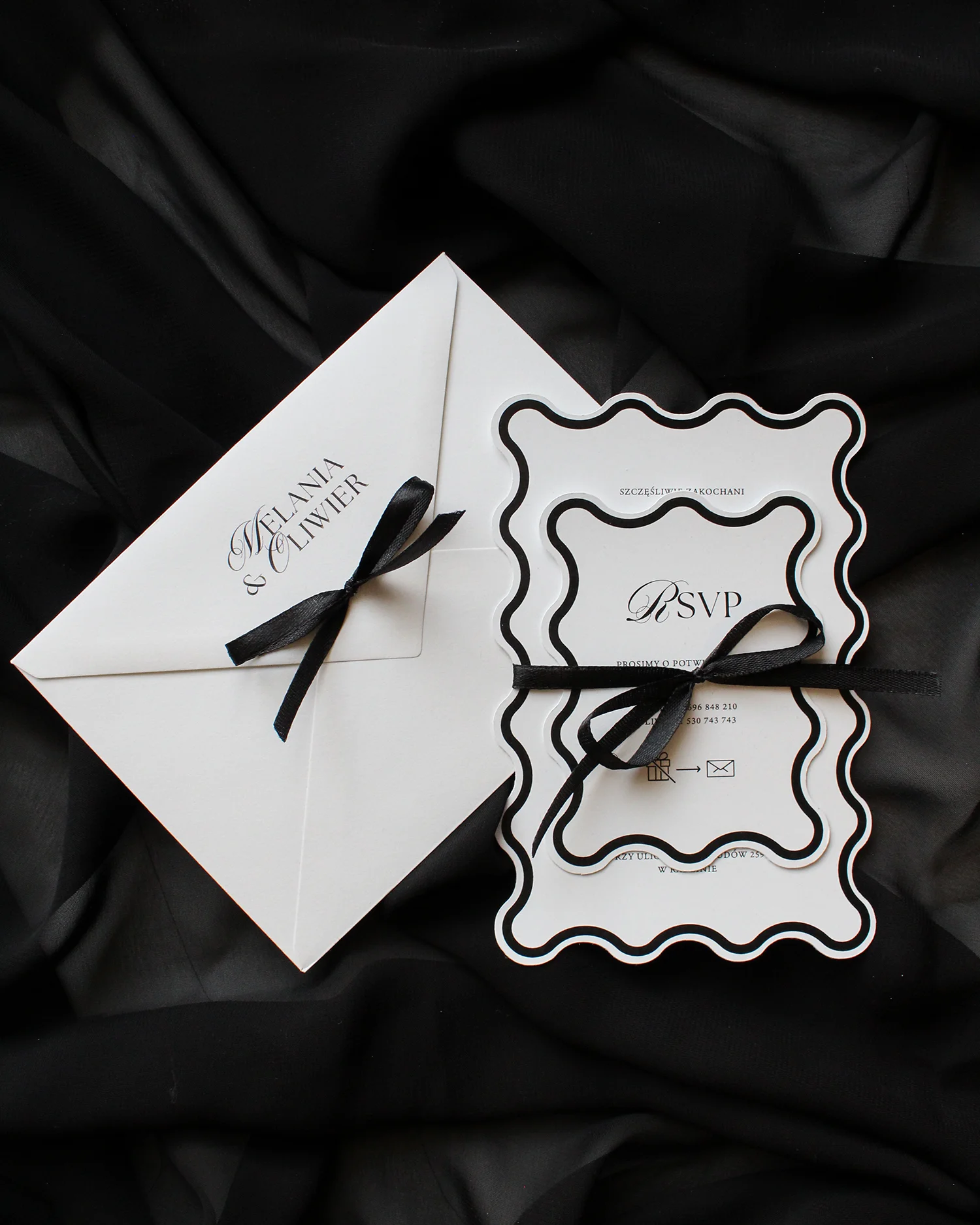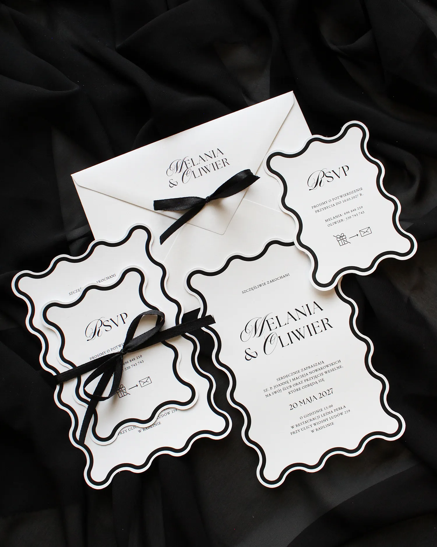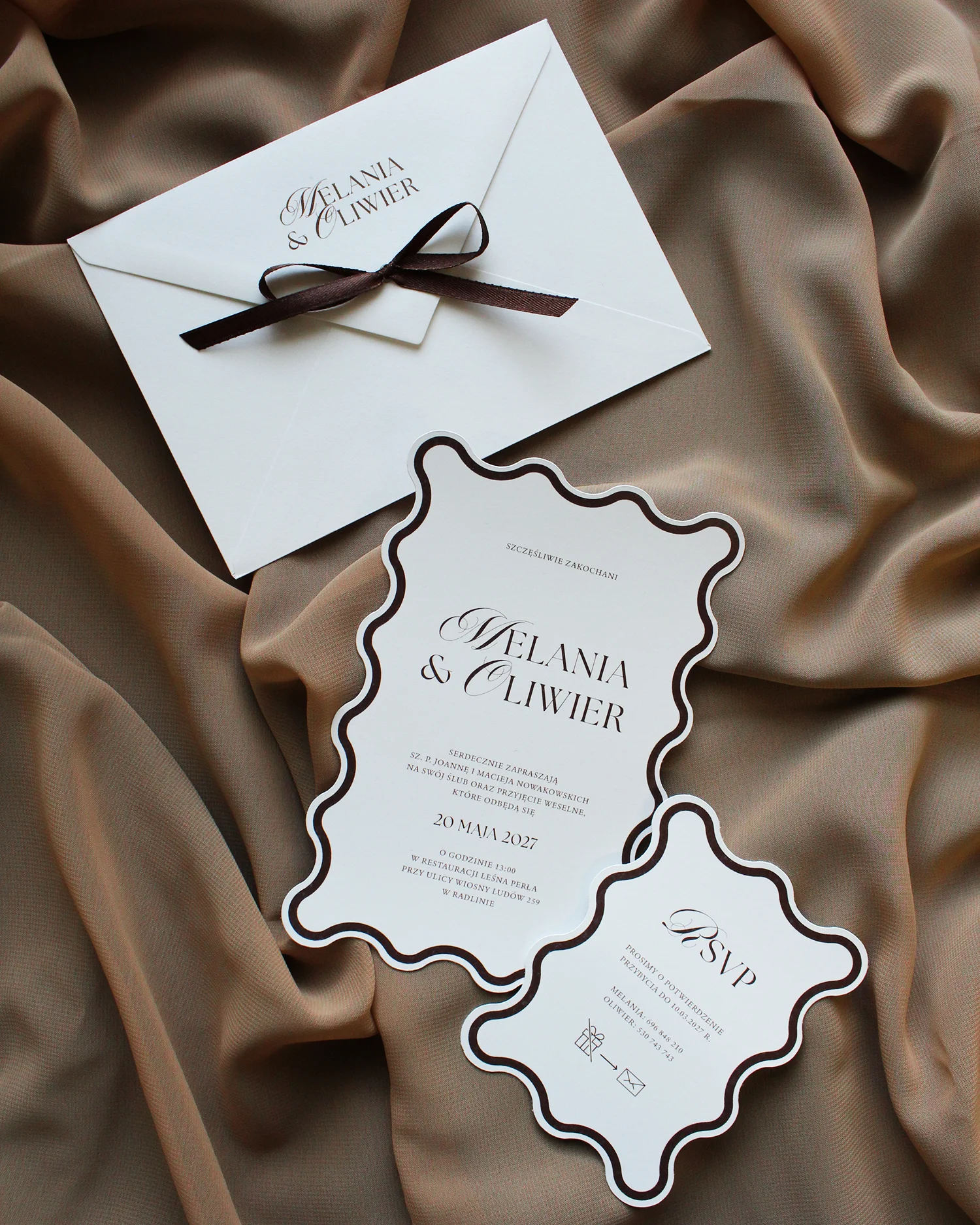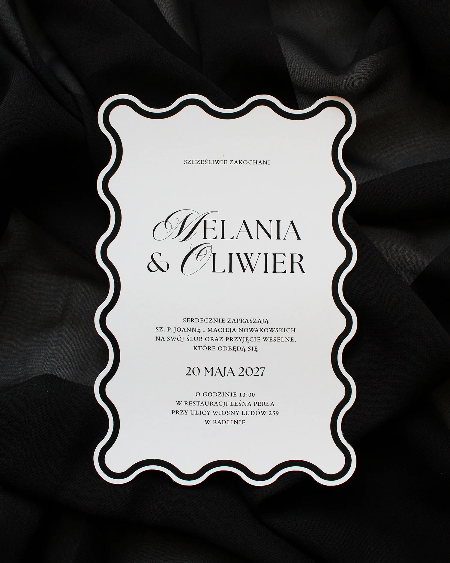 Zaproszenie ślubne Wave to propozycja dla Par, które szukają delikatnej, ale wyróżniającej się papeterii. Nietypowy kształt z falowanymi krawędziami sprawia, że każda karta prezentuje się wyjątkowo i elegancko, wprowadzając odrobinę finezji już na etapie zaproszenia.