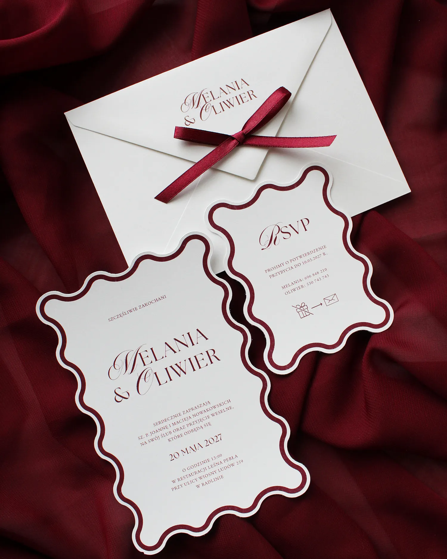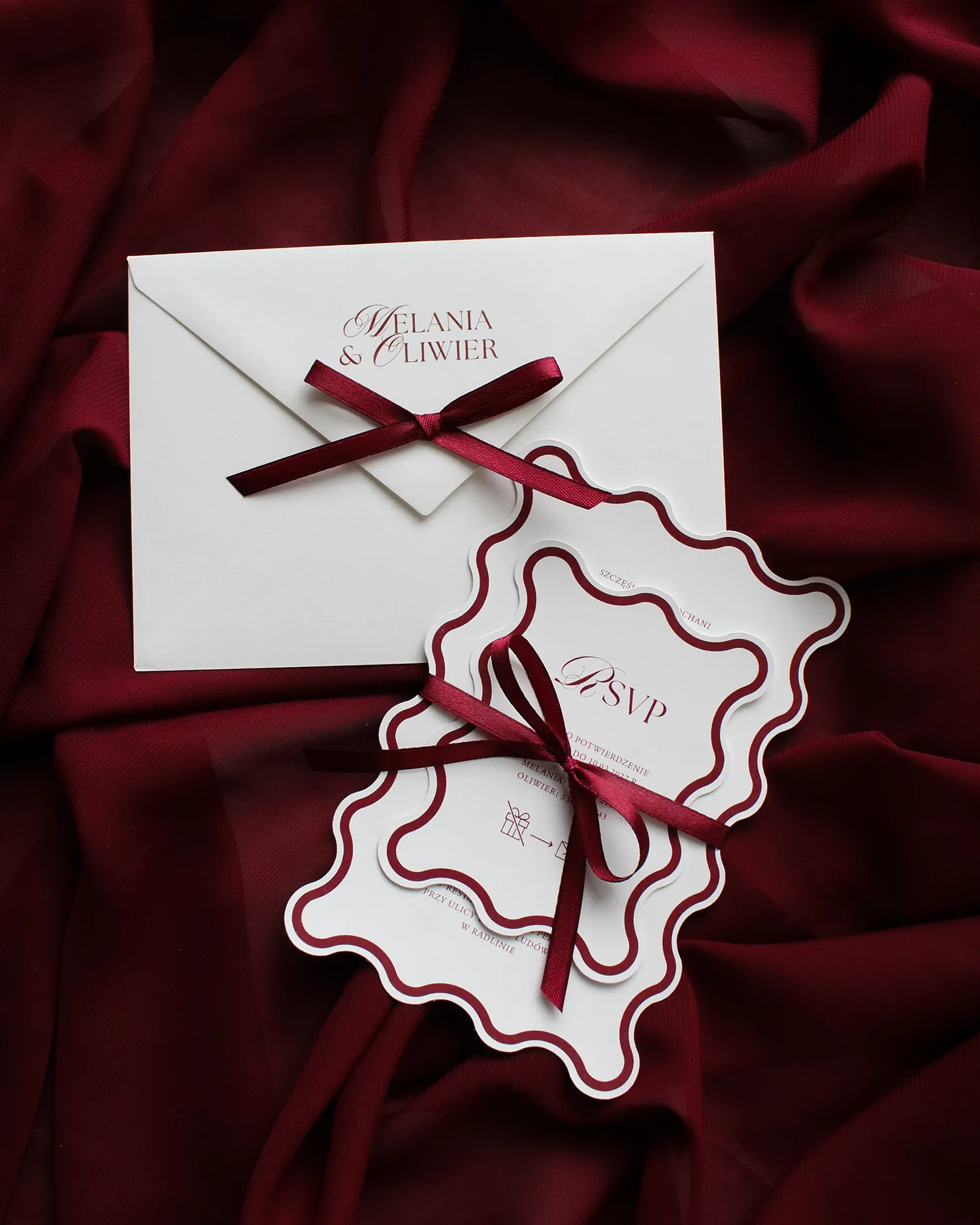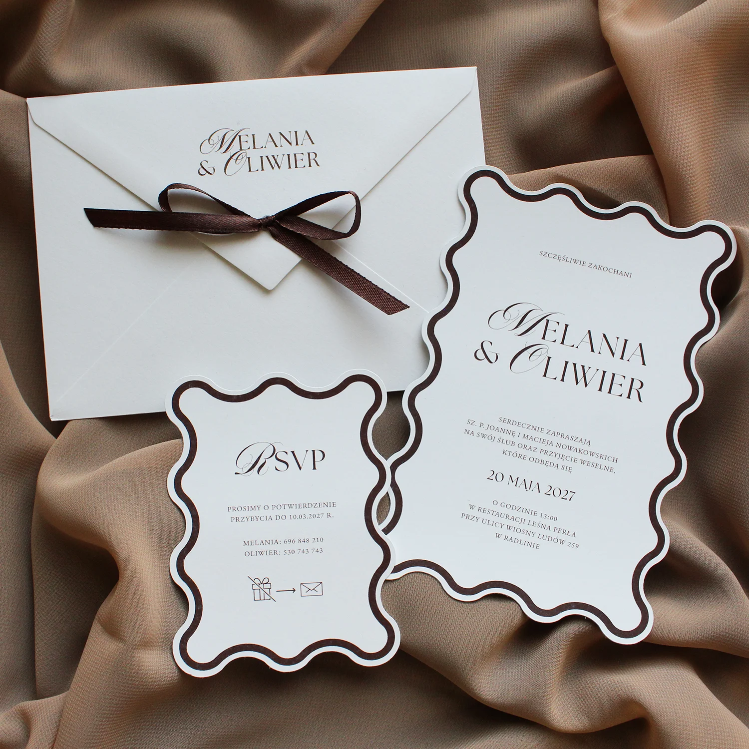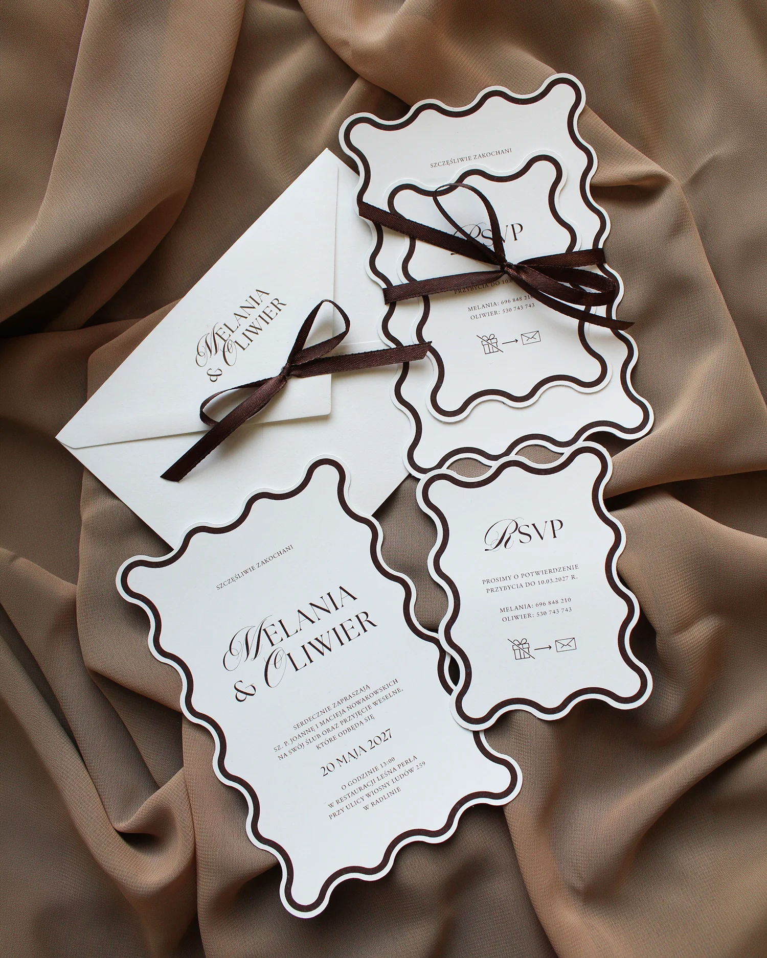 Całość utrzymana jest w harmonijnej, klasycznej kolorystyce – od jasnych kart po głębokie odcienie nadruków. Wyrazista typografia i dopracowane detale, takie jak wstążki czy dopasowana karta RSVP, podkreślają wyjątkowy charakter tej kolekcji. Zaproszenie Wave doskonale komponuje się zarówno z minimalistycznymi dodatkami, jak i bardziej rozbudowaną papeterią ślubną.