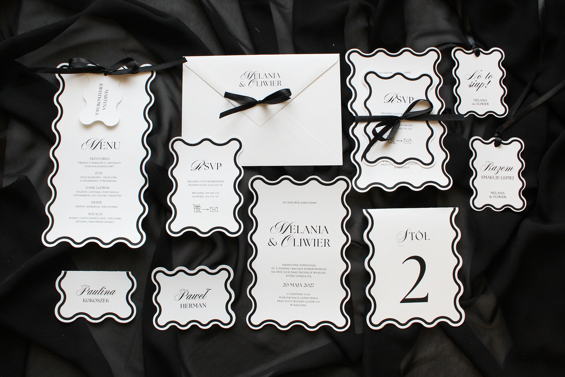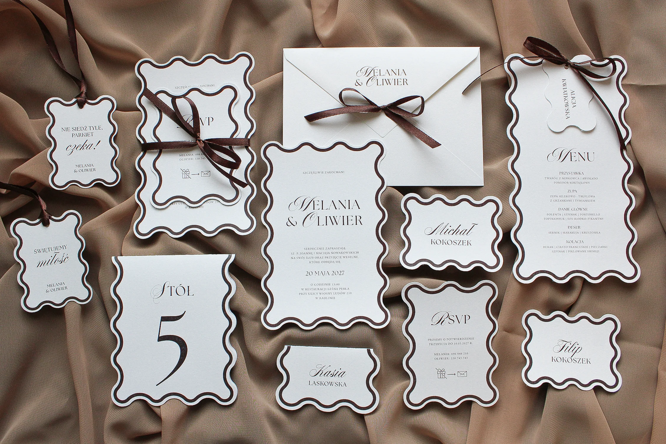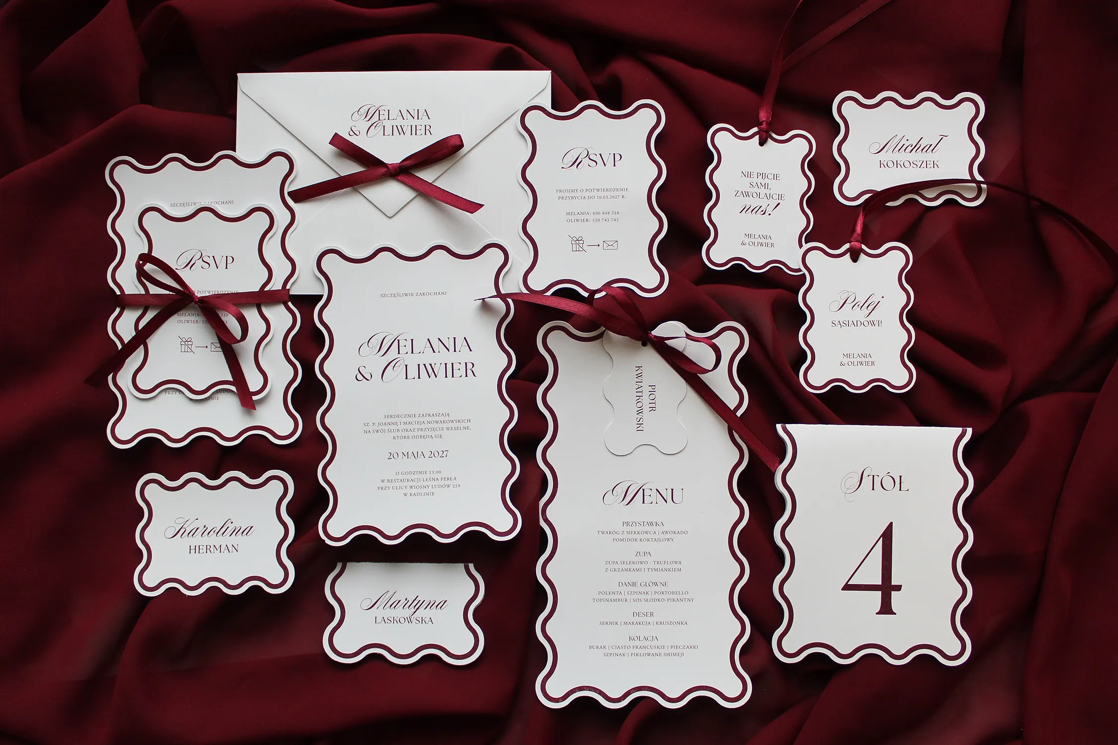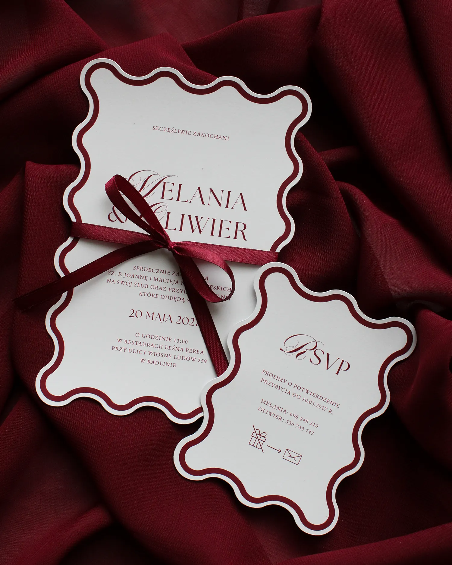 Całość utrzymana jest w harmonijnej, klasycznej kolorystyce – od jasnych kart po głębokie odcienie nadruków. Wyrazista typografia i dopracowane detale, takie jak wstążki czy dopasowana karta RSVP, podkreślają wyjątkowy charakter tej kolekcji. Zaproszenie Wave doskonale komponuje się zarówno z minimalistycznymi dodatkami, jak i bardziej rozbudowaną papeterią ślubną.